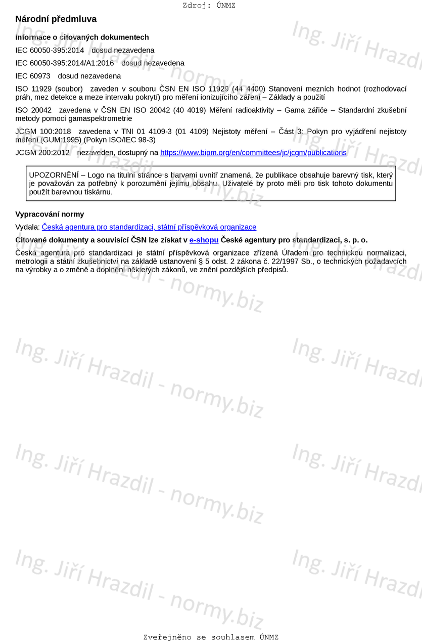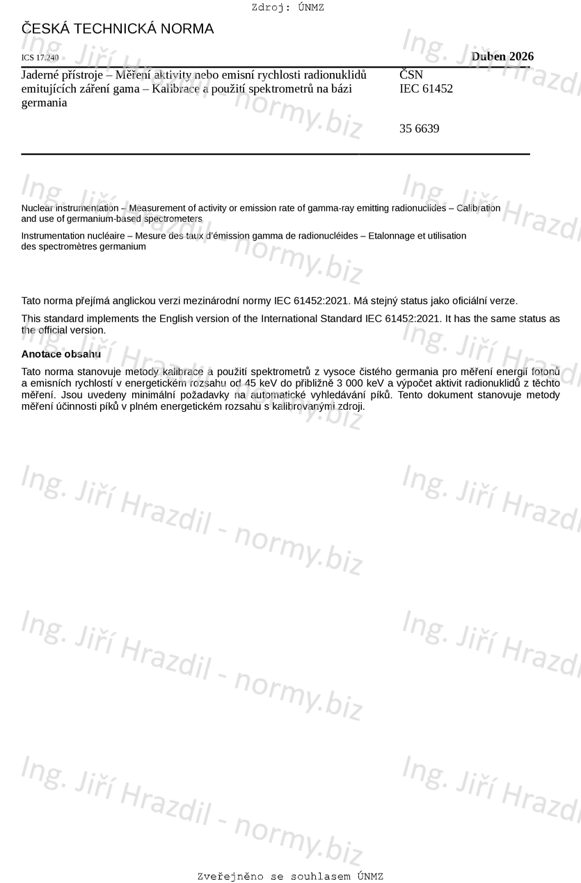 Tato norma stanovuje metody kalibrace a použití spektrometrů z vysoce čistého germania pro měření energií fotonů a emisních rychlostí v energetickém rozsahu od 45 keV do přibližně 3 000 keV a výpočet aktivit radionuklidů z těchto měření. Jsou uvedeny minimální požadavky na automatické vyhledávání píků. Tento dokument stanovuje metody měření účinnosti píků v plném energetickém rozsahu s kalibrovanými zdroji.