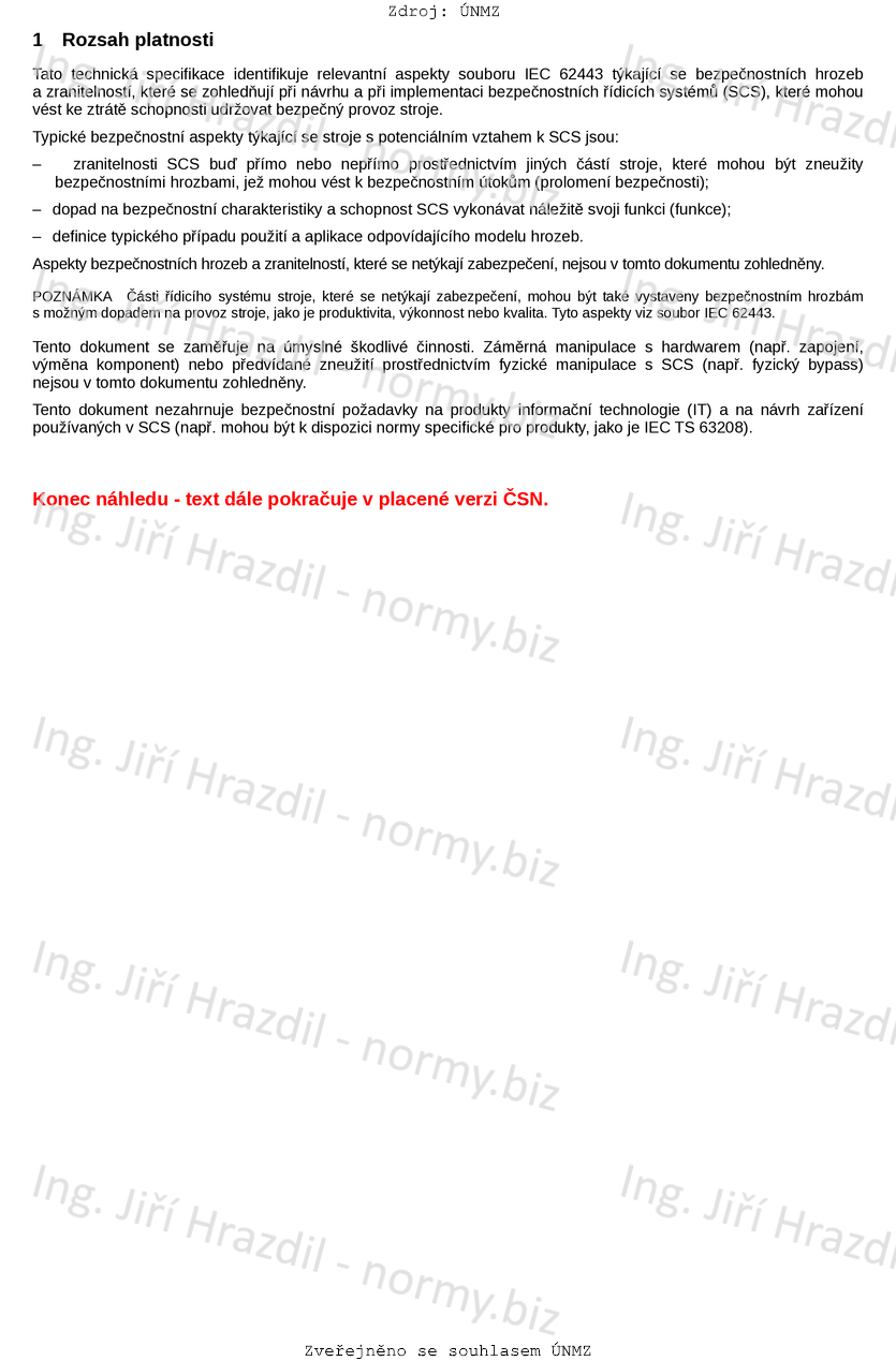 Tato technická specifikace identifikuje relevantní aspekty souboru IEC 62443 týkající se bezpečnostních hrozeb a zranitelností, které se zohledňují při návrhu a při implementaci bezpečnostních řídicích systémů (SCS), které mohou vést ke ztrátě schopnosti udržovat bezpečný provoz stroje.