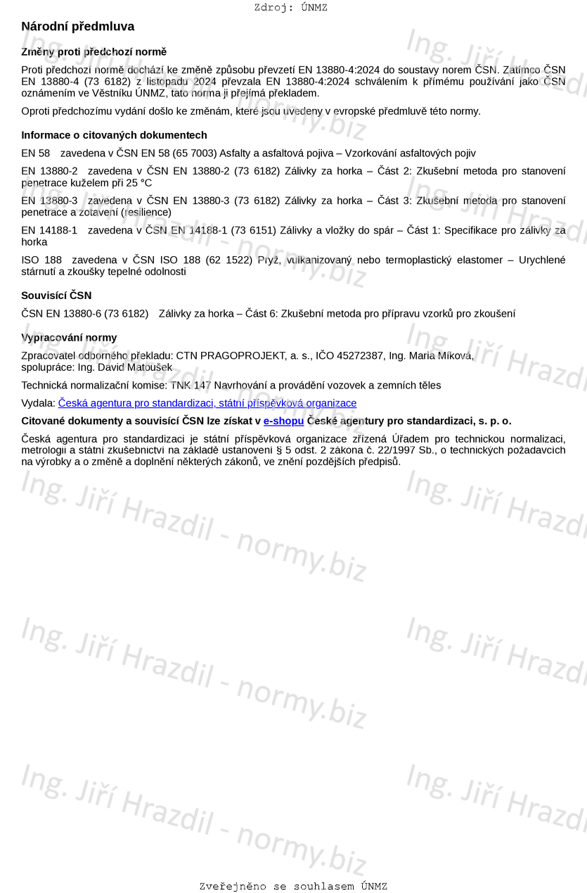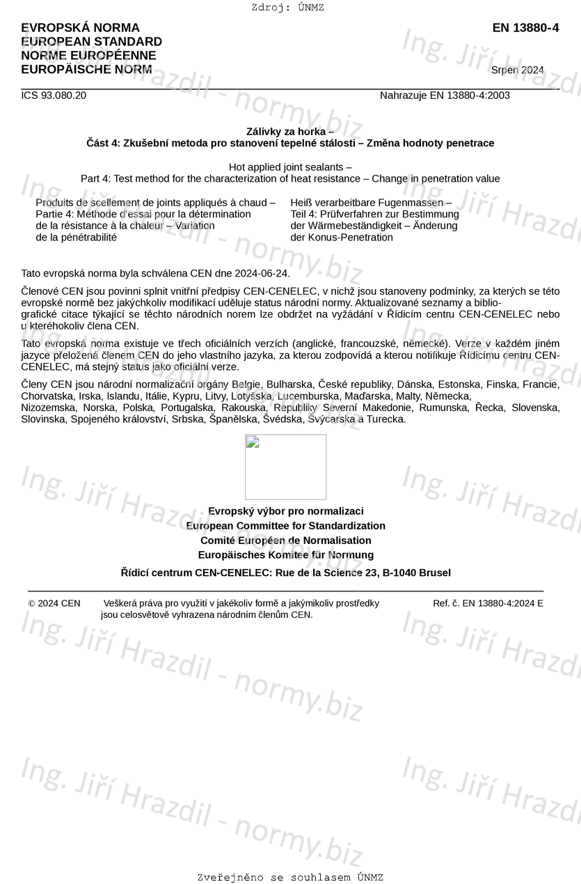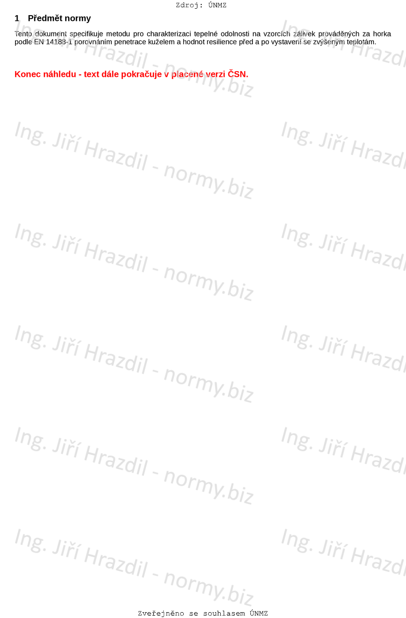 Tento dokument specifikuje metodu pro charakterizaci tepelné odolnosti na vzorcích zálivek prováděných za horka podle EN 14188-1 porovnáním penetrace kuželem a hodnot resilience před a po vystavení se zvýšeným teplotám.