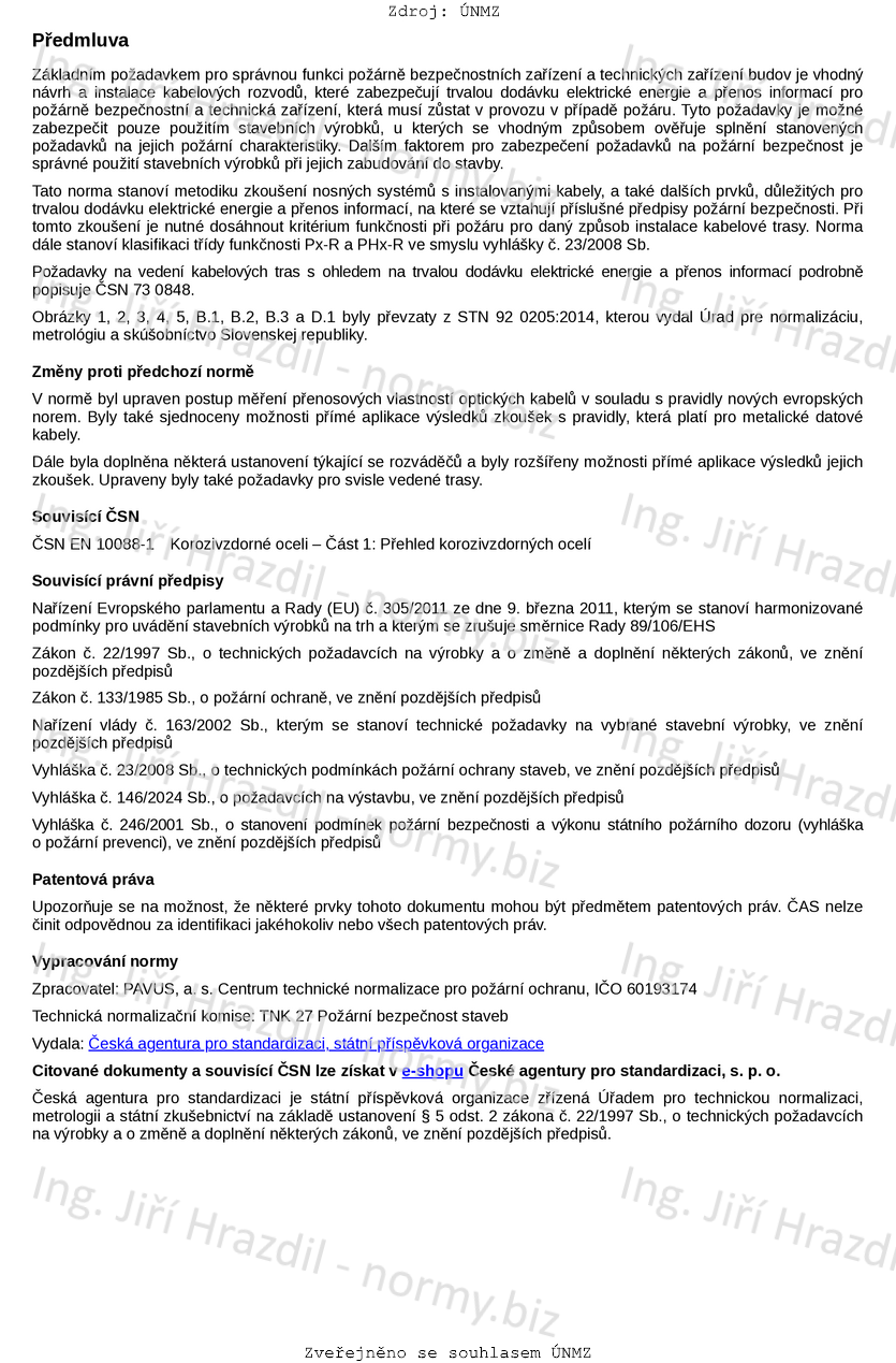 POZNÁMKA 1 - Uložení kabelů do chráněné kabelové trasy není předmětem této normy. Zkouška zachování funkčnosti požárně ochranných systémů, jako jsou např. kabelové kanály, je uvedena v ČSN EN 1366-11+A1. Podmínky uložení do stavební konstrukce jsou uvedeny v ČSN 73 0848.