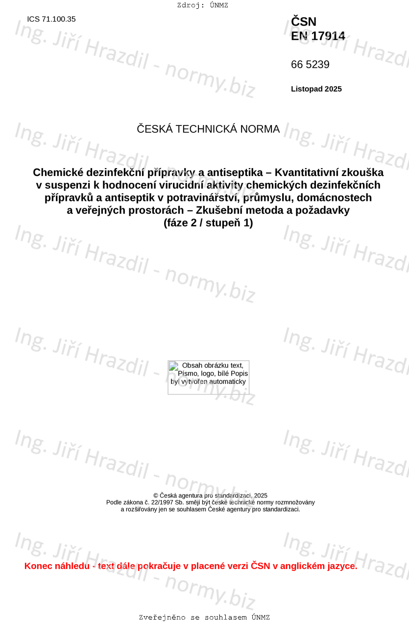This document specifies a test method and the minimum requirements for virucidal activity of chemical disinfectant and antiseptic products that form a homogeneous physically stable preparation when diluted with hard water or, in the case of ready-to-use products (i.e. products that are not diluted when applied), with water. Products can only be tested at a concentration of 80 % (97 %, with a modified method for special cases) as some dilution is always produced by adding the test organisms and interfering substance.