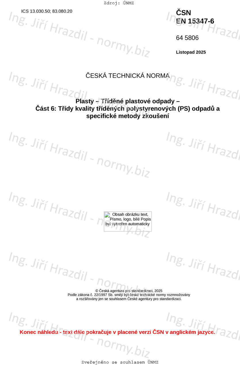 Plasty - Tříděné plastové odpady - Část 5: Třídy kvality tříděných polyvinylchloridových (PVC) odpadů a specifické metody zkoušení