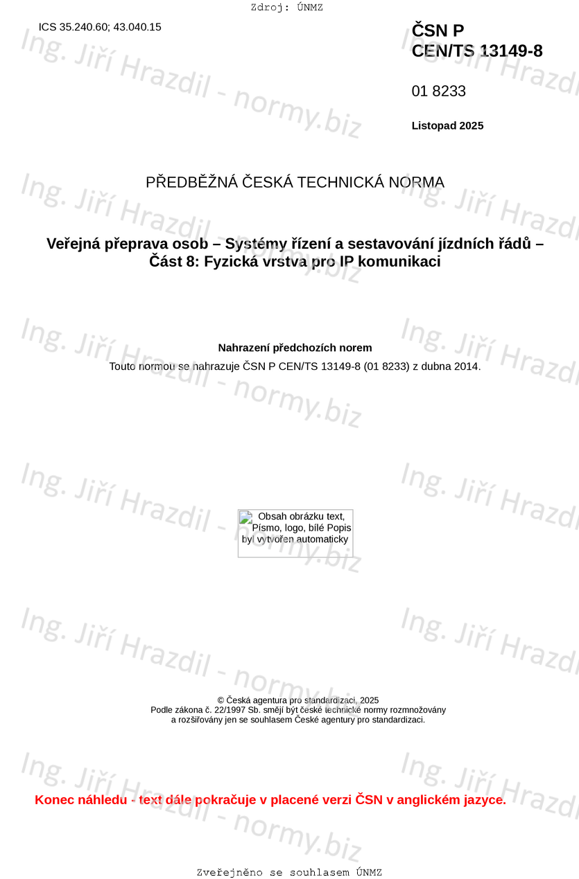 | Označení | ČSN P CEN/TS 13149-8 (018233) |