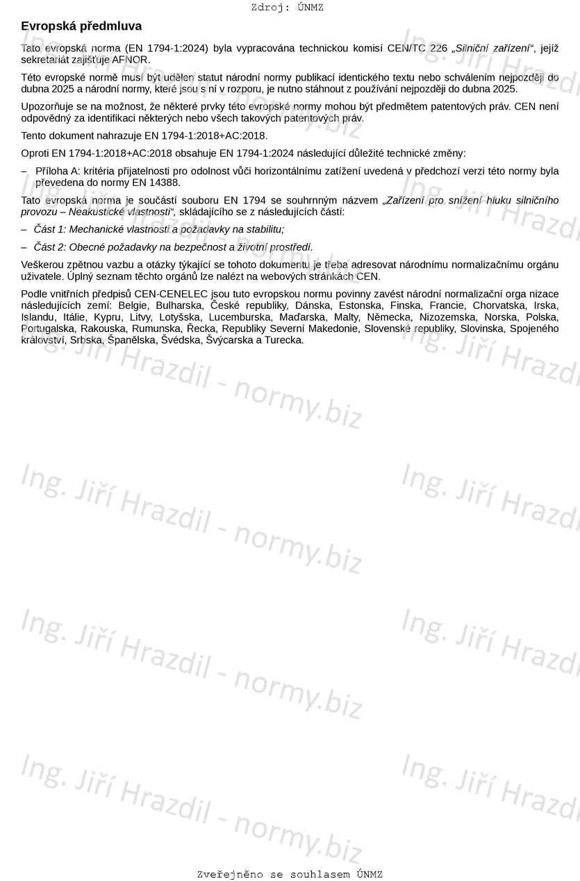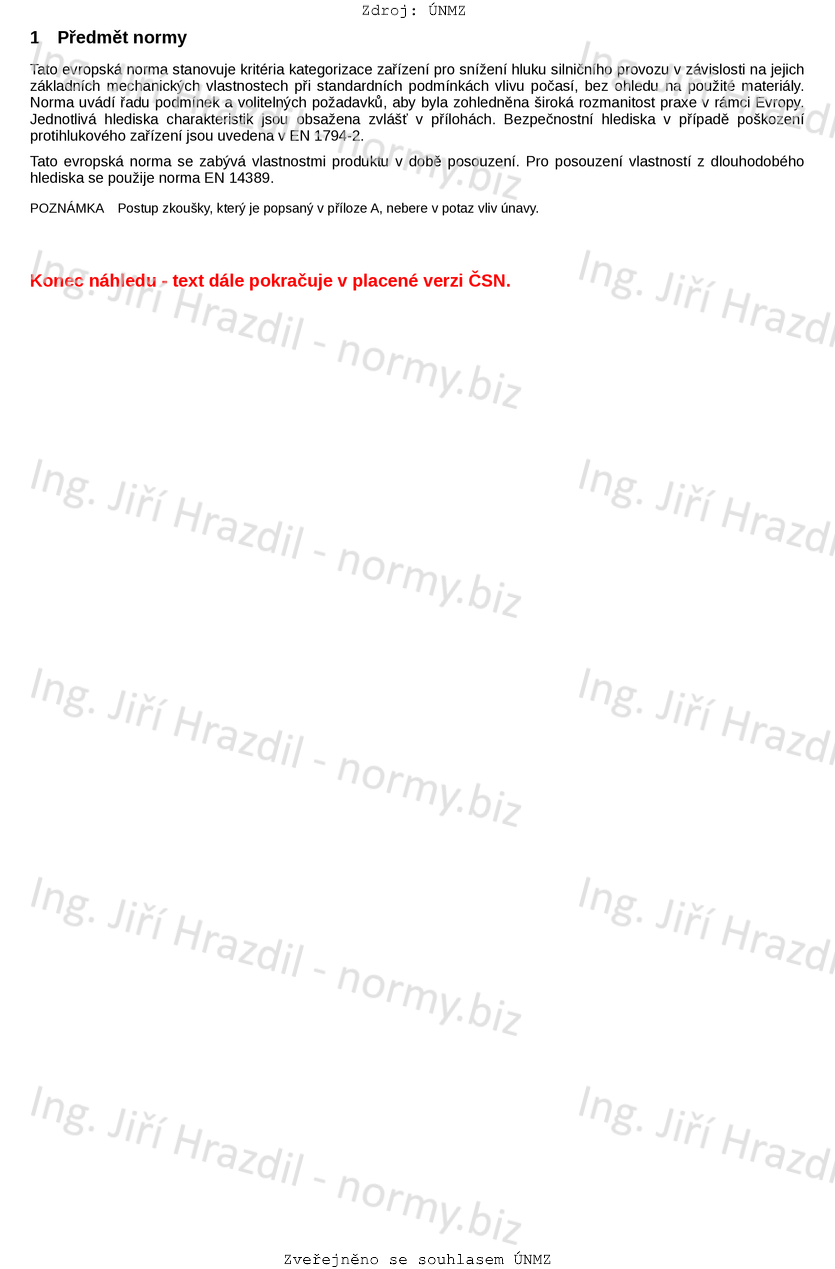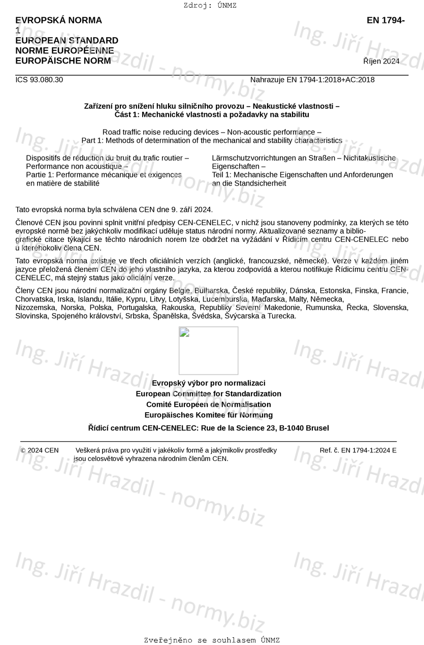 Tato evropská norma stanovuje kritéria kategorizace zařízení pro snížení hluku silničního provozu v závislosti na jejich základních mechanických vlastnostech při standardních podmínkách vlivu počasí, bez ohledu na použité materiály. Norma uvádí řadu podmínek a volitelných požadavků, aby byla zohledněna široká rozmanitost praxe v rámci Evropy. Jednotlivá hlediska charakteristik jsou obsažena zvlášť v přílohách. Bezpečnostní hlediska v případě poškození protihlukového zařízení jsou uvedena v EN 1794-2.