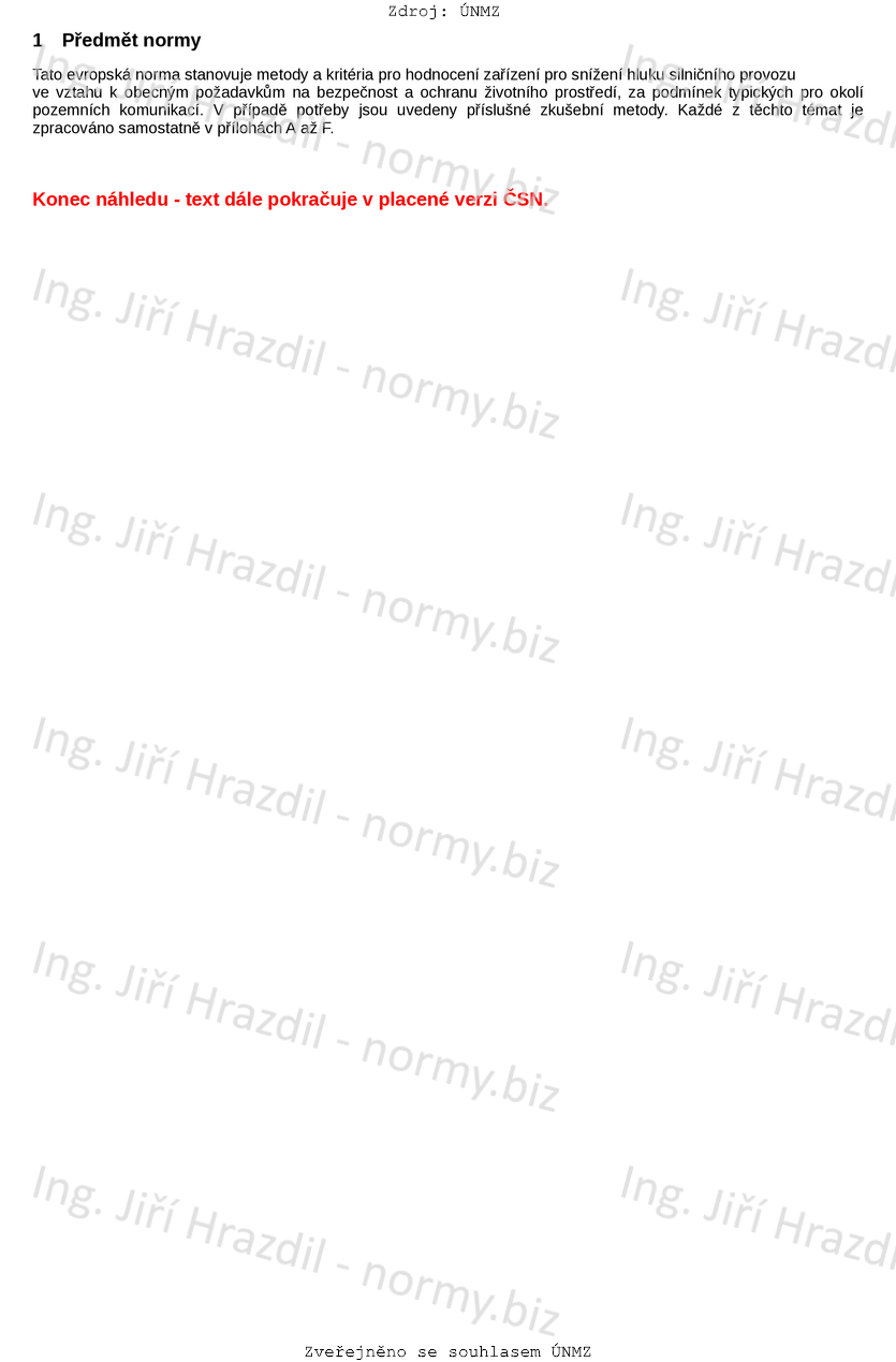 Tato evropská norma stanovuje metody a kritéria pro hodnocení zařízení pro snížení hluku silničního provozu ve vztahu k obecným požadavkům na bezpečnost a ochranu životního prostředí, za podmínek typických pro okolí pozemních komunikací. V případě potřeby jsou uvedeny příslušné zkušební metody. Každé z těchto témat je zpracováno samostatně v přílohách A až F.