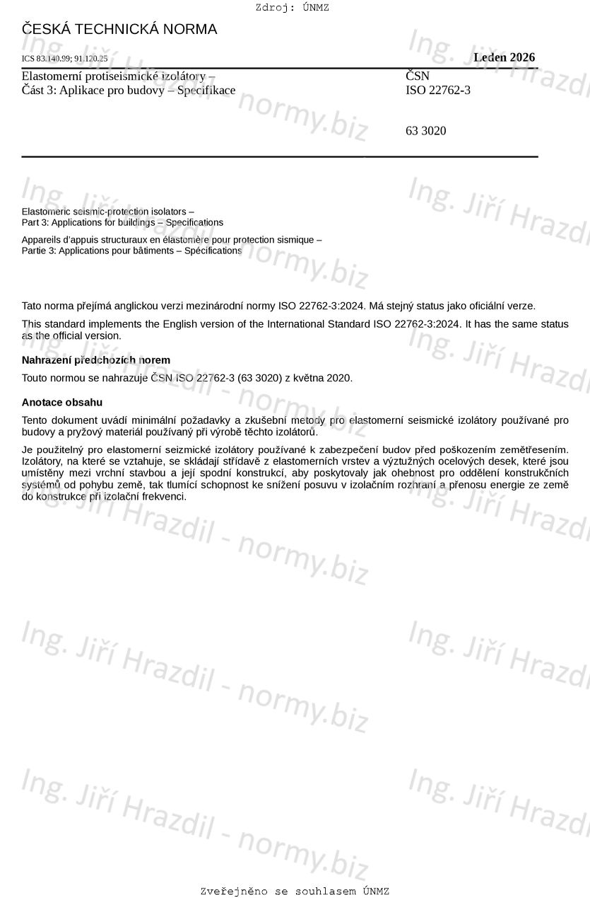 Je použitelný pro elastomerní seizmické izolátory používané k zabezpečení budov před poškozením zemětře-sením. Izolátory, na které se vztahuje, se skládají střídavě z elastomerních vrstev a výztužných ocelových desek, které jsou umístěny mezi vrchní stavbou a její spodní konstrukcí, aby poskytovaly jak ohebnost pro oddělení konstrukčních systémů od pohybu země, tak tlumící schopnost ke snížení posuvu v izolačním roz-hraní a přenosu energie ze země do konstrukce při izolační frekvenci.