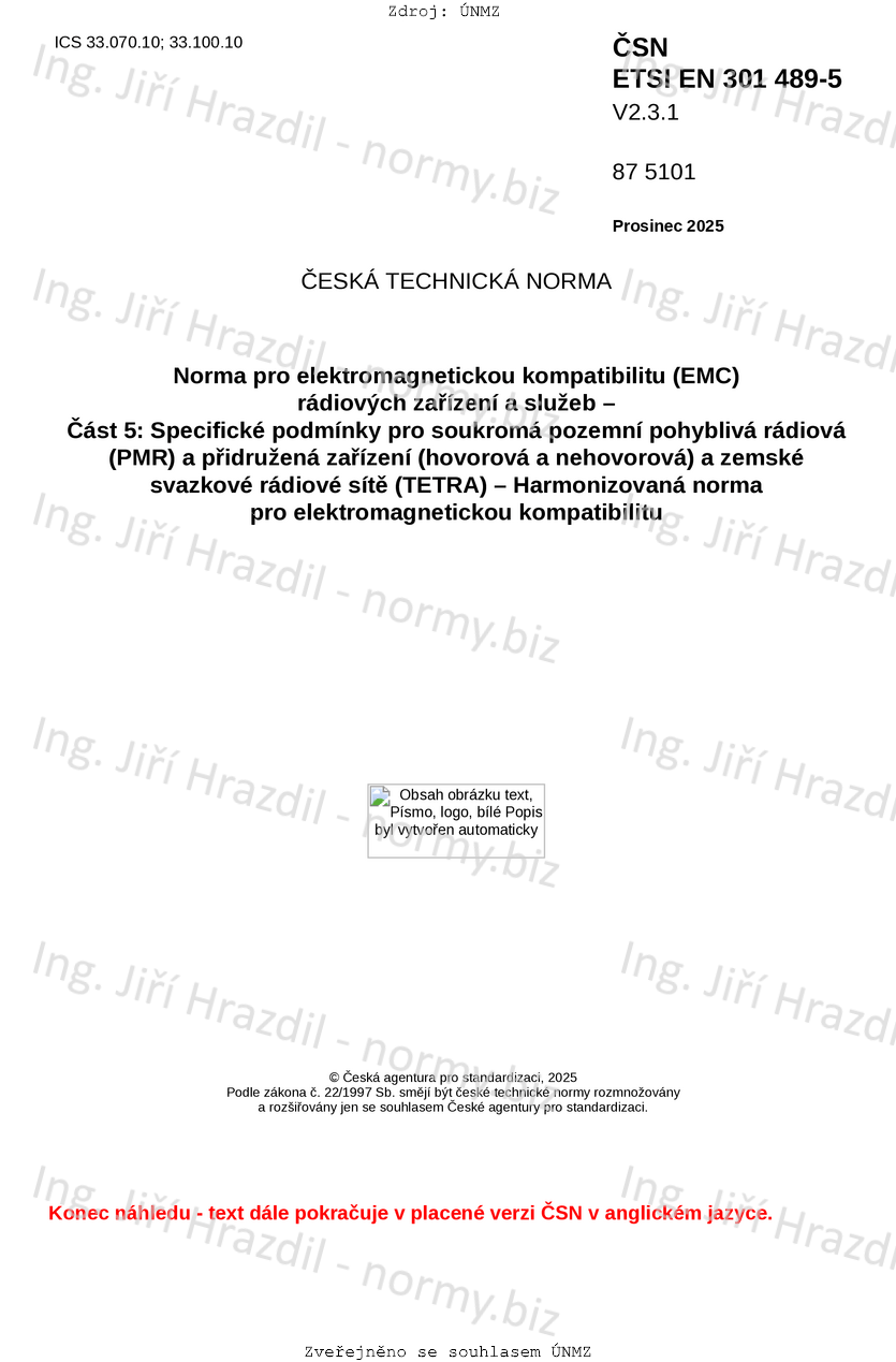 Elektromagnetická kompatibilita a rádiové spektrum (ERM) - Norma pro elektromagnetickou kompatibilitu (EMC) rádiových zařízení a služeb - Část 5: Specifické podmínky pro soukromá pozemní pohyblivá rádiová (PMR) a přidružená zařízení (hovorová a nehovorová)