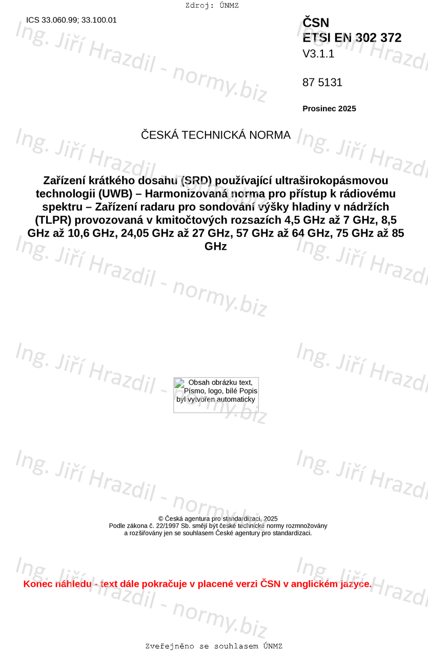 ČSN ETSI EN 302 372 V3.1.1 Zařízení krátkého dosahu (SRD) používající ultraširokopásmovou technologii (UWB) - Harmonizovaná norma pro přístup k rádiovému spektru - Zařízení radaru pro sondování výšky hladiny v nádržích (TLPR) provozovaná v kmitočtových rozsazích 4,5 GHz až 7 GHz, 8,5 GHz až 10,6 GHz, 24,05 GHz až 27 GHz, 57 GHz až 64 GHz, 75 GHz až 85 GHz