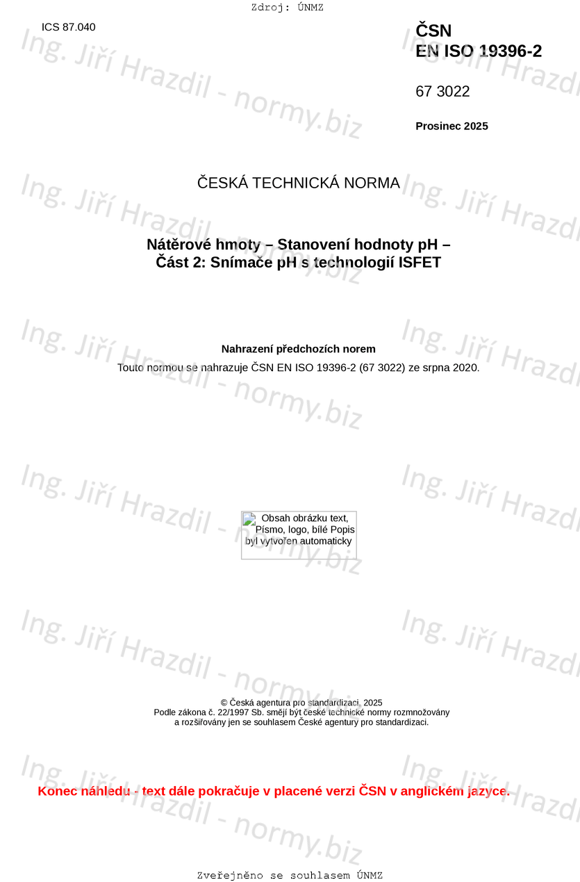 ČSN EN ISO 19396-2 Nátěrové hmoty - Stanovení hodnoty pH - Část 2: Snímače pH s technologií ISFET