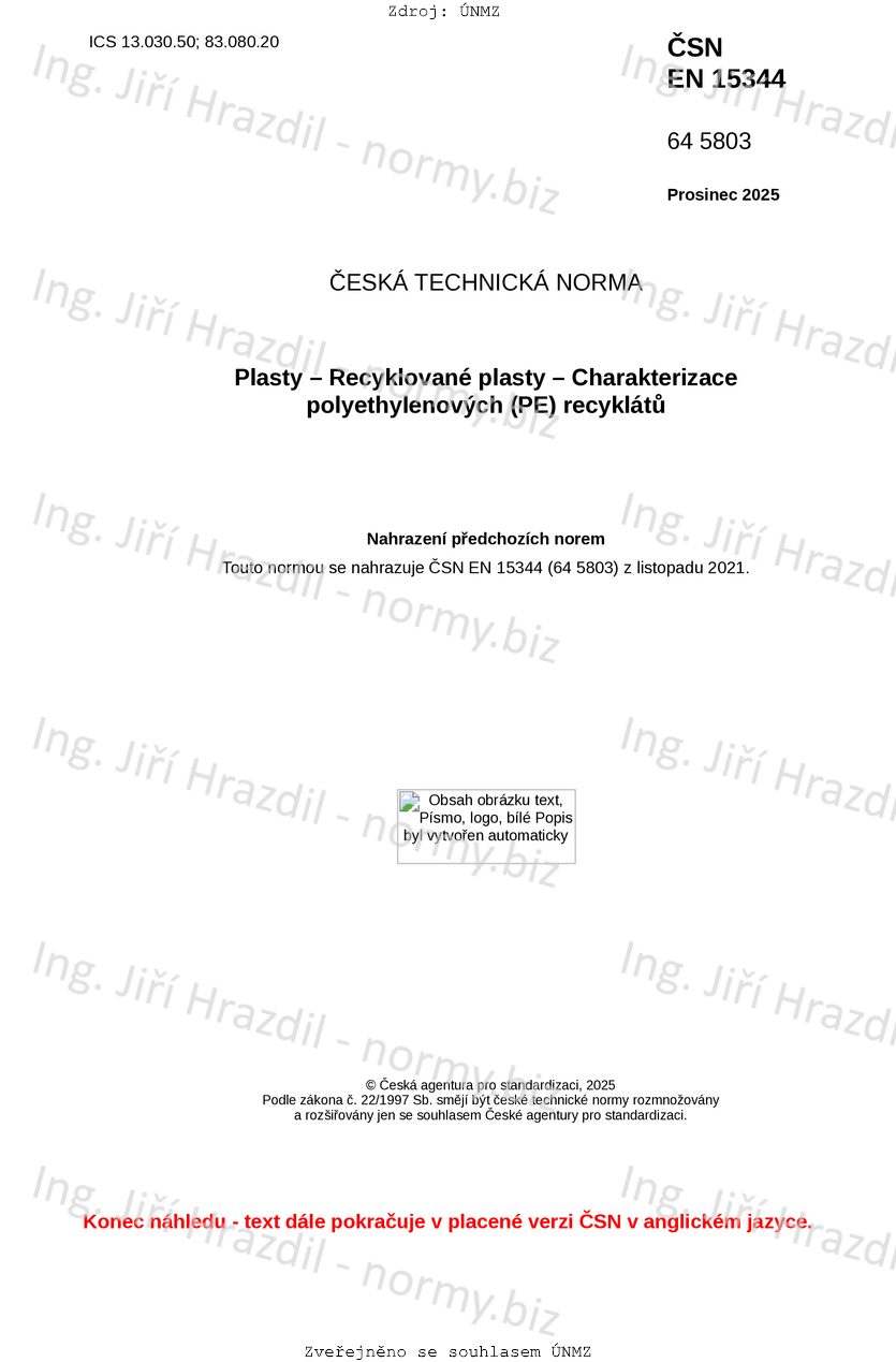 ČSN EN 15344 Plasty - Recyklované plasty - Charakterizace polyethylenových (PE) recyklátů