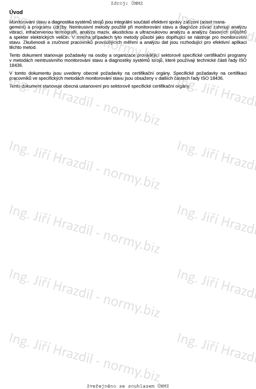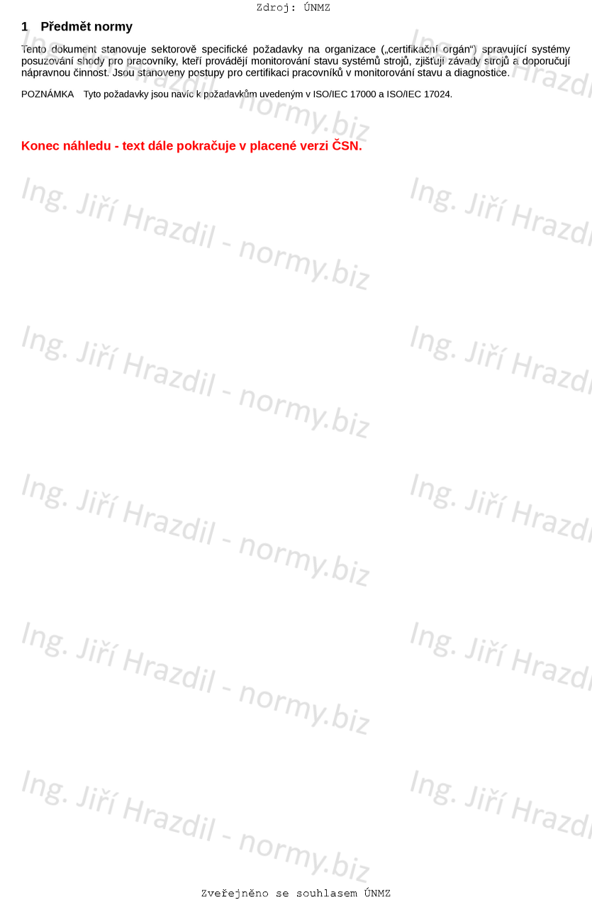 Tento dokument stanovuje sektorově specifické požadavky na organizace ("certifikační orgán") spravující systémy posuzování shody pro pracovníky, kteří provádějí monitorování stavu systémů strojů, zjišťují závady strojů a doporučují nápravnou činnost. Jsou stanoveny postupy pro certifikaci pracovníků v monitorování stavu a diagnostice.