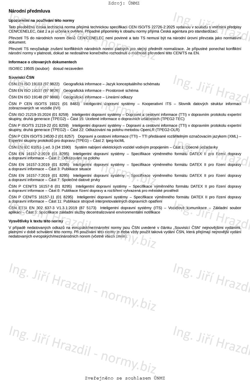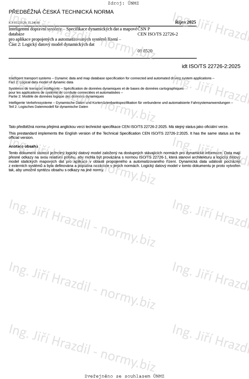 Tento dokument stanoví jednotný logický datový model založený na dostupných stávajících normách pro dynamické informace. Data mají přesné odkazy na svou relativní polohu, aby mohla být provázána s normou ISO/TS 22726-1, která stanoví architekturu a logický datový model statických mapových dat pro aplikace v oblasti propojeného a automatizovaného řízení. Dynamická data událostí pocházejí z externích systémů a byla definována a popsána nezávisle v jiných normách. Logický datový model v tomto dokumentu je proto vytvořen tak, aby umožnil syntézu obsahu s odkazy na jiné normy.
