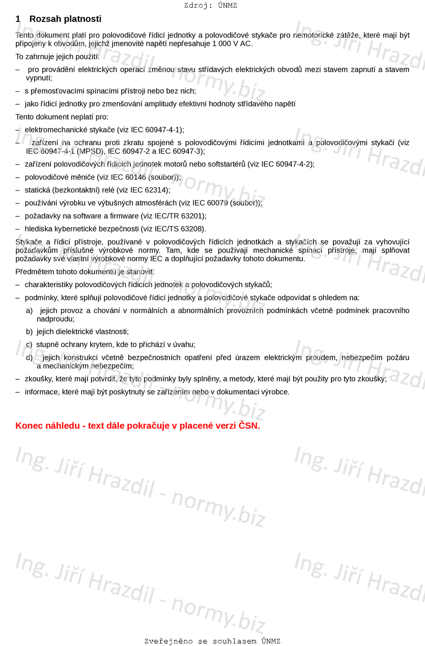 Tato norma platí pro polovodičové řídicí jednotky a polovodičové stykače pro nemotorické zátěže, které mají být připojeny k obvodům, jejichž jmenovité napětí nepřesahuje 1 000 V AC.