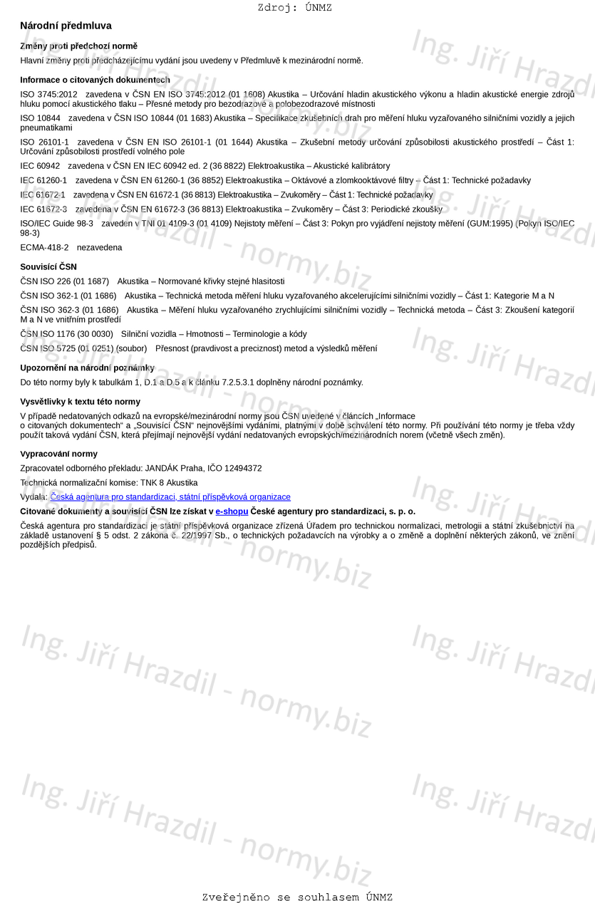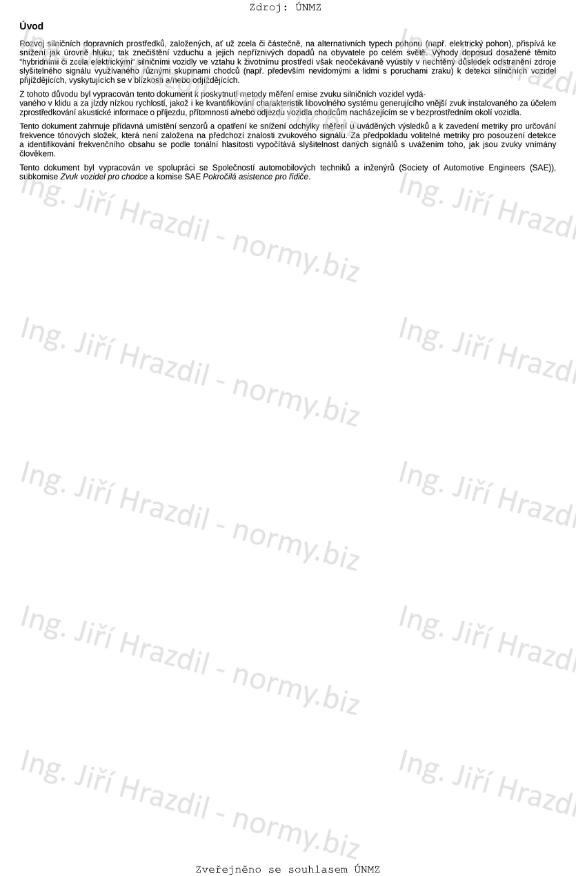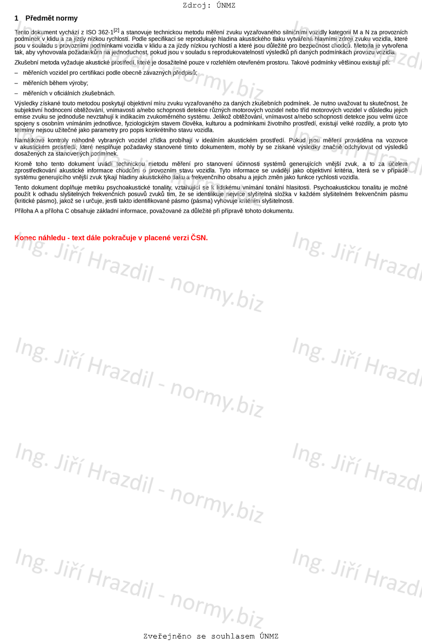 Tento dokument vychází z ISO 362-1[2] a stanovuje technickou metodu měření zvuku vyzařovaného silničními vozidly kategorií M a N za provozních podmínek v klidu a za jízdy nízkou rychlostí. Podle specifikací se reprodukuje hladina akustického tlaku vytvářená hlavními zdroji zvuku vozidla, které jsou v souladu s provozními podmínkami vozidla v klidu a za jízdy nízkou rychlostí a které jsou důležité pro bezpečnost chodců. Metoda je vytvořena tak, aby vyhovovala požadavkům na jednoduchost, pokud jsou v souladu s reprodukovatelností výsledků při daných podmínkách provozu vozidla.