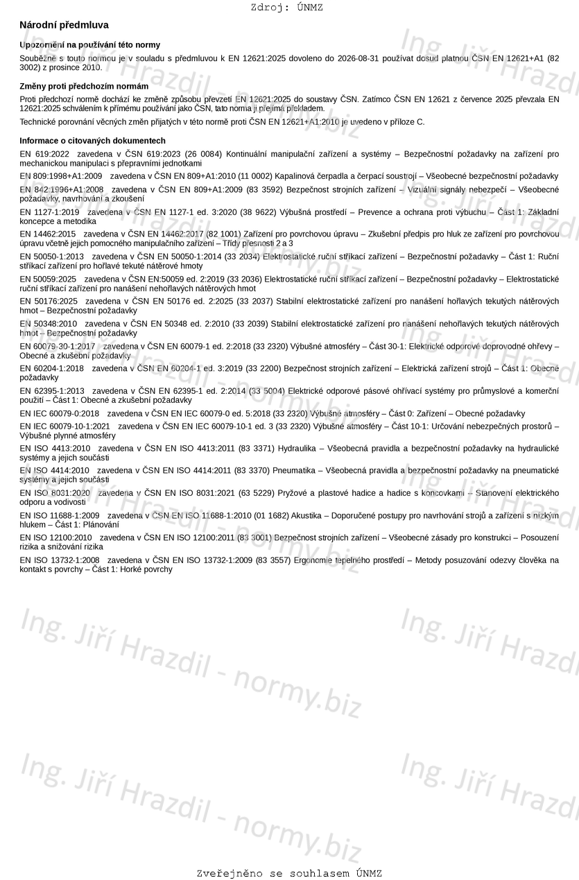 Společně s tímto dokumentem uvádí požadavky na elektrostatické strojní zařízení pro dodávání a cirkulaci tekutých nátěrových hmot EN 50050-1:2013, EN 50059:2025, EN 50176:2025, nebo EN 50348:2010.