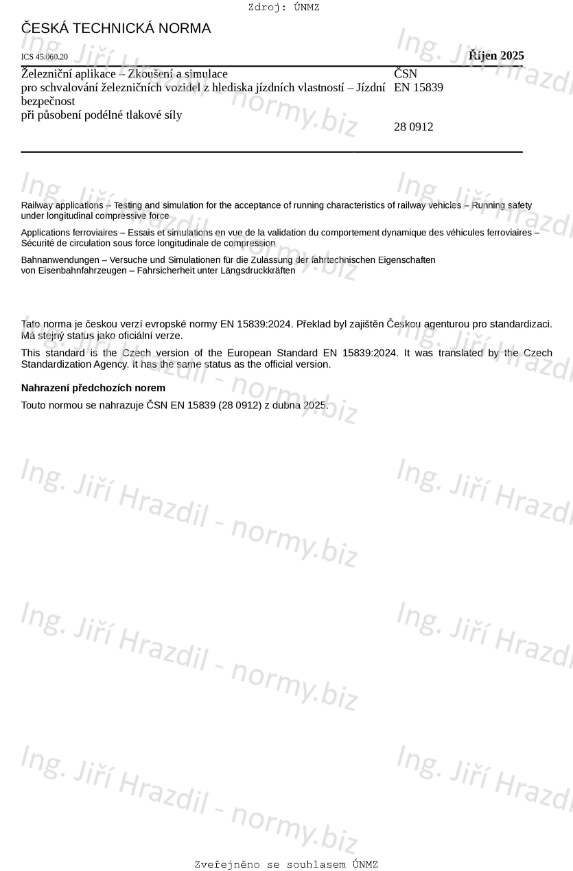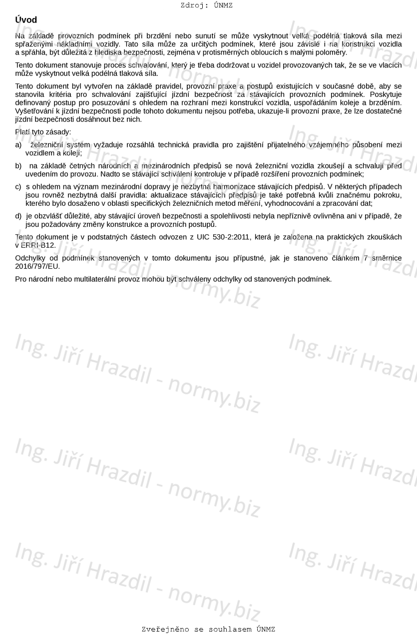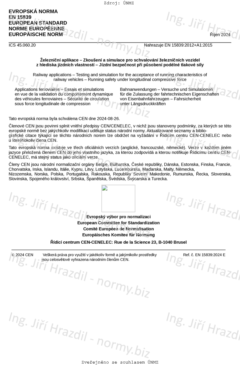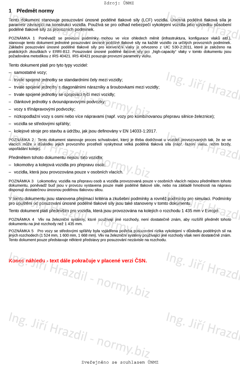 Tento dokument stanovuje posuzování únosné podélné tlakové síly (LCF) vozidla. Únosná podélná tlaková síla je parametr závisející na konstrukci vozidla. Používá se pro odhad ne-bezpečí vykolejení vozidla jako výsledku působení podélné tlakové síly za provozních pod-mínek. Dokument platí pro samostatné vozy, trvale spojené jednotky se standardními čely mezi vozidly, trvale spojené jednotky s diagonálními nárazníky a šroubovkami mezi vozidly, trvale spojené jednotky se spojovací tyčí mezi vozidly, článkové jednotky s dvounápravovými podvozky, vozy s třínápravovými podvozky, nízkopodlažní vozy s osmi nebo více nápravami (např. vozy pro kombinovanou přepravu silnice-železnice), vozidla se středovými spřáhly a pro kolejové stroje pro stavbu a údržbu definované v EN 14033-1:2017.