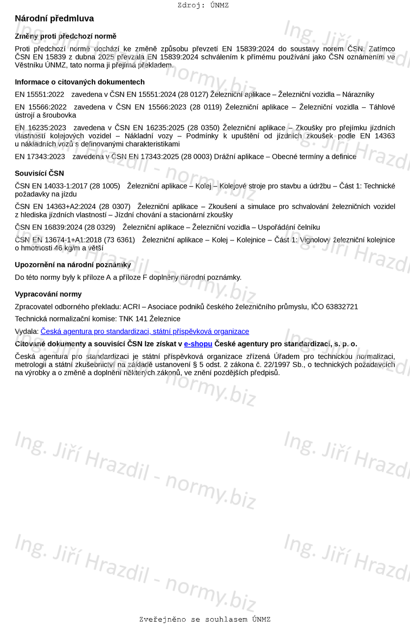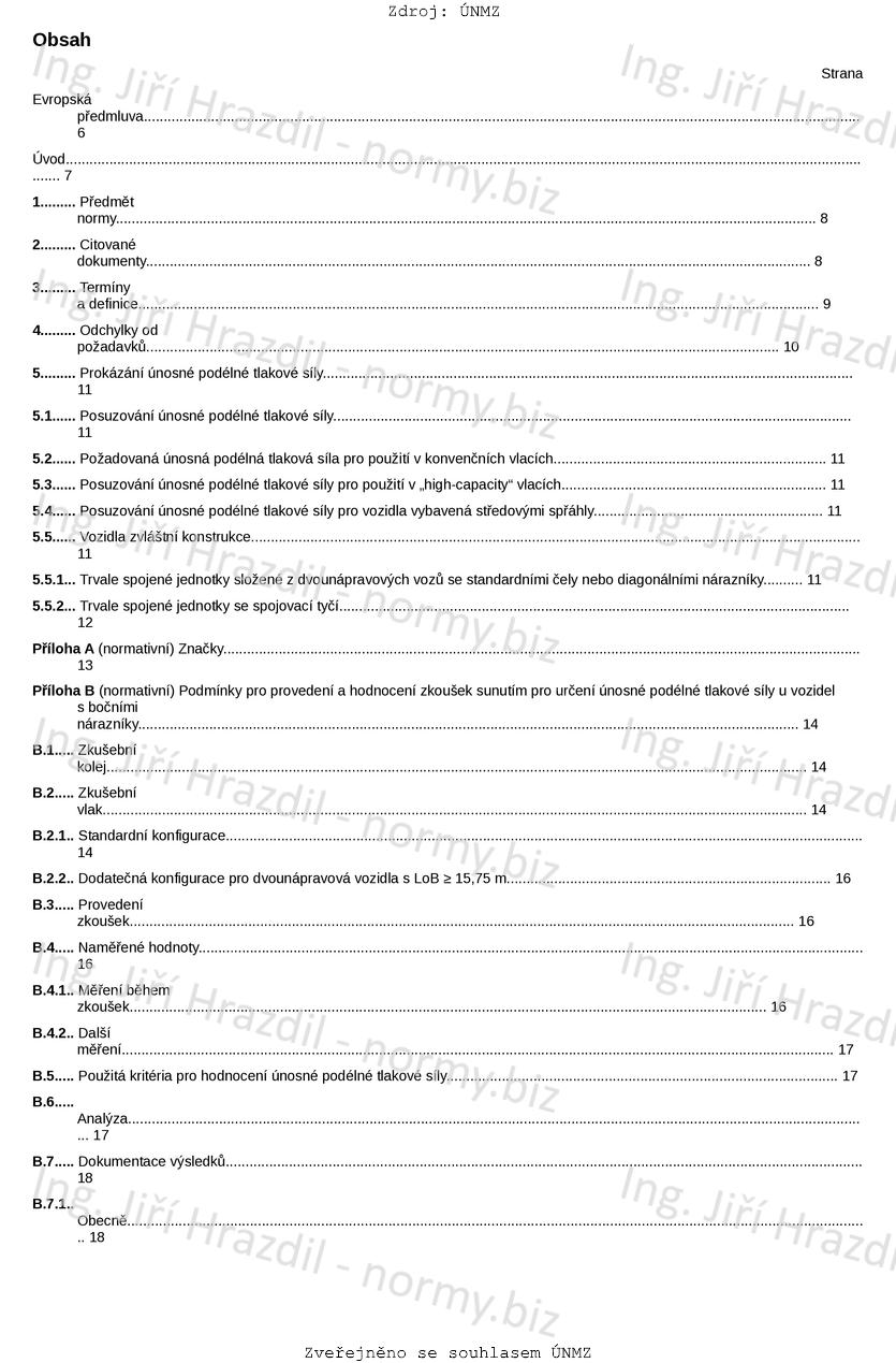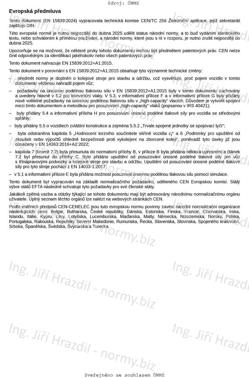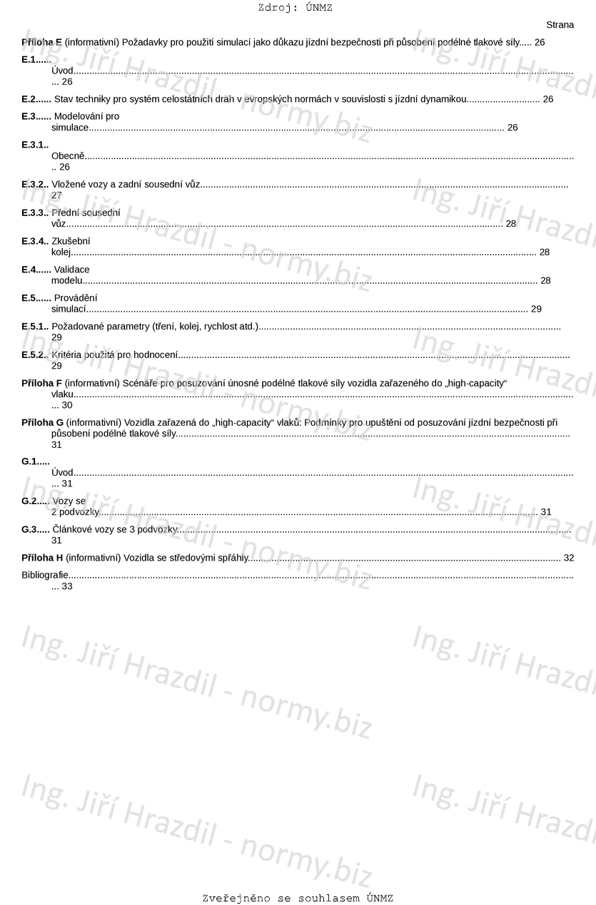 Tento dokument stanovuje posuzování únosné podélné tlakové síly (LCF) vozidla. Únosná podélná tlaková síla je parametr závisející na konstrukci vozidla. Používá se pro odhad ne-bezpečí vykolejení vozidla jako výsledku působení podélné tlakové síly za provozních pod-mínek. Dokument platí pro samostatné vozy, trvale spojené jednotky se standardními čely mezi vozidly, trvale spojené jednotky s diagonálními nárazníky a šroubovkami mezi vozidly, trvale spojené jednotky se spojovací tyčí mezi vozidly, článkové jednotky s dvounápravovými podvozky, vozy s třínápravovými podvozky, nízkopodlažní vozy s osmi nebo více nápravami (např. vozy pro kombinovanou přepravu silnice-železnice), vozidla se středovými spřáhly a pro kolejové stroje pro stavbu a údržbu definované v EN 14033-1:2017.