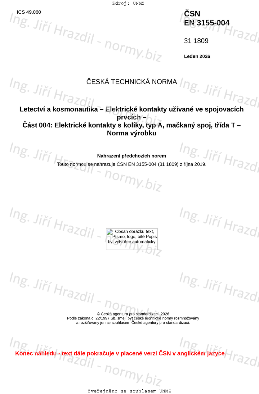 ČSN EN 3155-004 Letectví a kosmonautika - Elektrické kontakty užívané ve spojovacích prvcích - Část 004: Elektrické kontakty s kolíky, typ A, mačkaný spoj, třída T - Norma výrobku