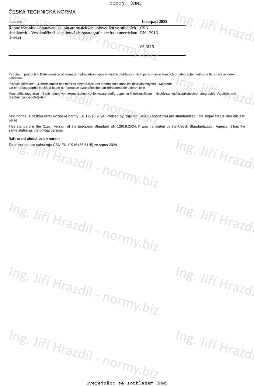 Tento dokument specifikuje zkušební metodu pro stanovení obsahu monoaromatických, diaromatických a tri+aromatických uhlovodíků v motorové naftě, parafinické naftě a ropných destilátech.