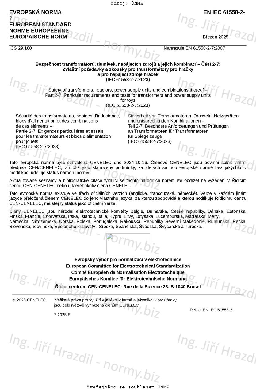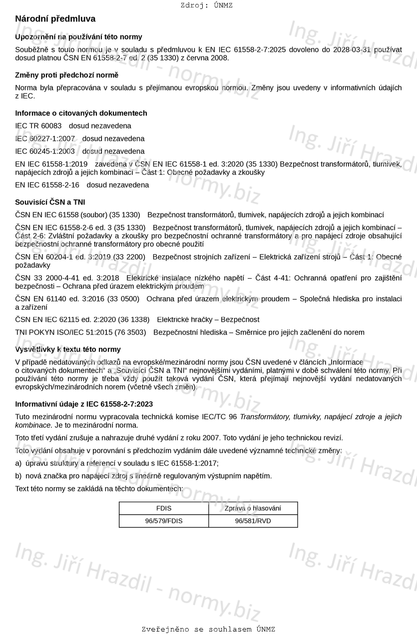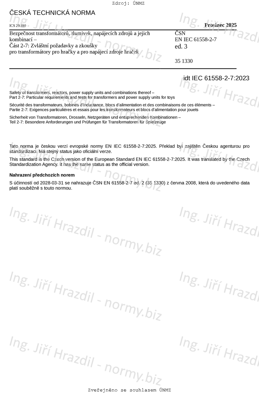 | Označení | ČSN EN IEC 61558-2-7 ed. 3 (351330) |