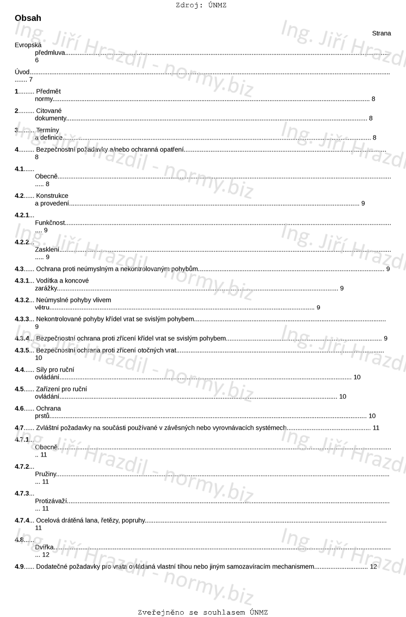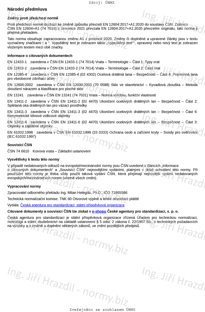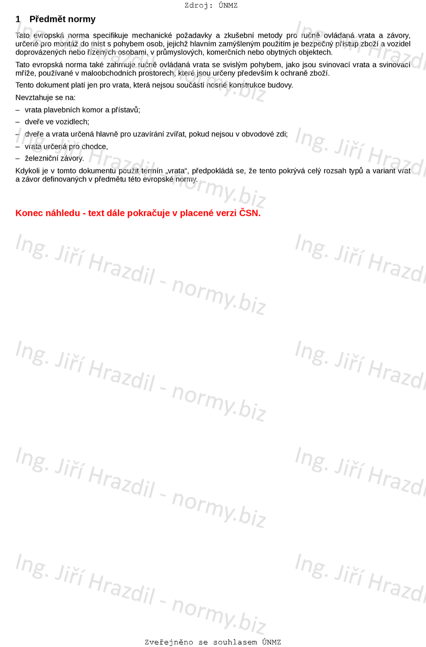 Tato evropská norma specifikuje mechanické požadavky a zkušební metody pro ručně ovládaná vrata a závory, určené pro montáž do míst s pohybem osob, jejichž hlavním zamýšleným použitím je bezpečný přístup zboží a vozidel doprovázených nebo řízených osobami, v průmyslových, komerčních nebo obytných objektech.