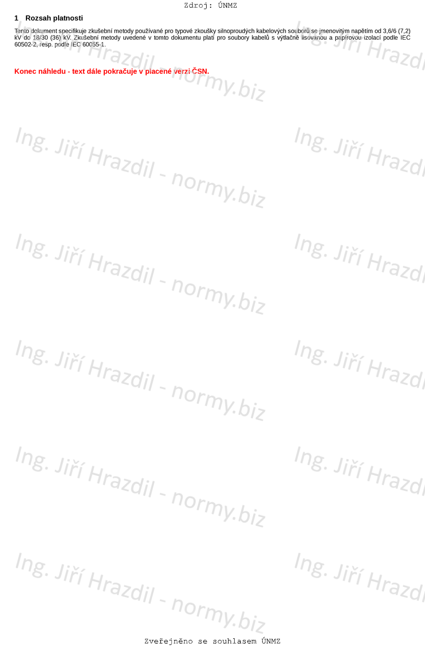 Tato norma specifikuje zkušební metody používané pro typové zkoušky silnoproudých kabelových souborů se jmenovitým napětím od 3,6/6 (7,2) kV do 18/30 (36) kV. Zkušební metody uvedené v tomto dokumentu platí pro soubory kabelů s výtlačně lisovanou a papírovou izolací podle IEC 60502-2, resp. podle IEC 60055-1.