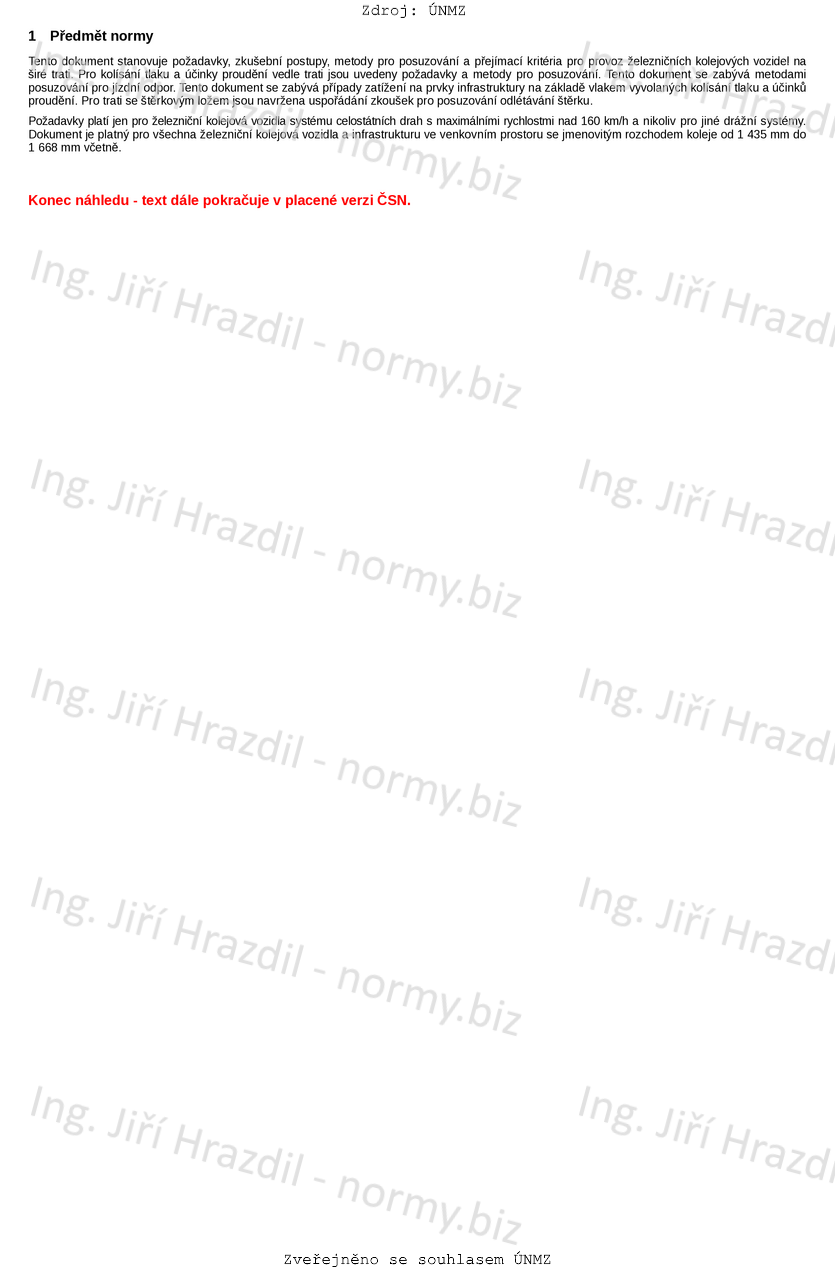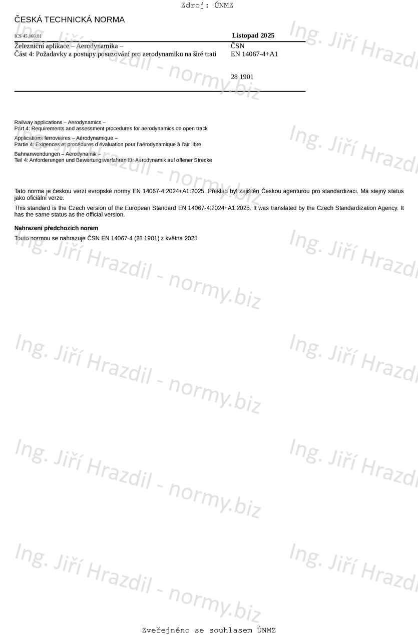 Tento dokument stanovuje požadavky, zkušební postupy, metody pro posuzování a přejímací kritéria pro provoz železničních kolejových vozidel na širé trati. Pro kolísání tlaku a účinky proudění vedle trati jsou uvedeny požadavky a metody pro posuzování. Tento dokument se zabývá metodami posuzování pro jízdní odpor. Tento dokument se zabývá případy zatížení na prvky infrastruktury na základě vlakem vyvolaných kolísání tlaku a účinků proudění. Pro trati se štěrkovým ložem jsou navržena uspořádání zkoušek pro posuzování odlétávání štěrku.