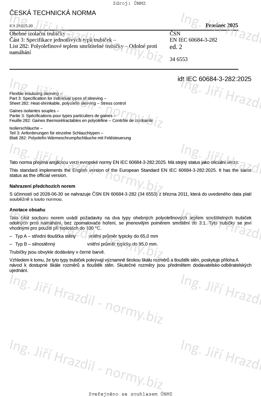 ČSN EN IEC 60684-3-282 ed. 2 Ohebné izolační trubičky - Část 3: Specifikace jednotlivých typů trubiček - List 282: Polyolefinové teplem smrštitelné trubičky - Odolné proti namáhání