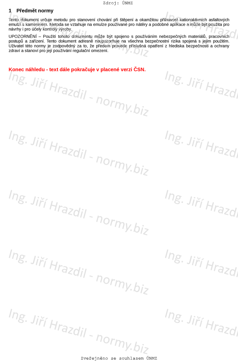 Tento dokument určuje metodu pro stanovení chování při štěpení a okamžitou přilnavost kationaktivních asfaltových emulzí s kamenivem. Metoda se vztahuje na emulze používané pro nátěry a podobné aplikace a může být použita pro návrhy i pro účely kontroly výroby.
