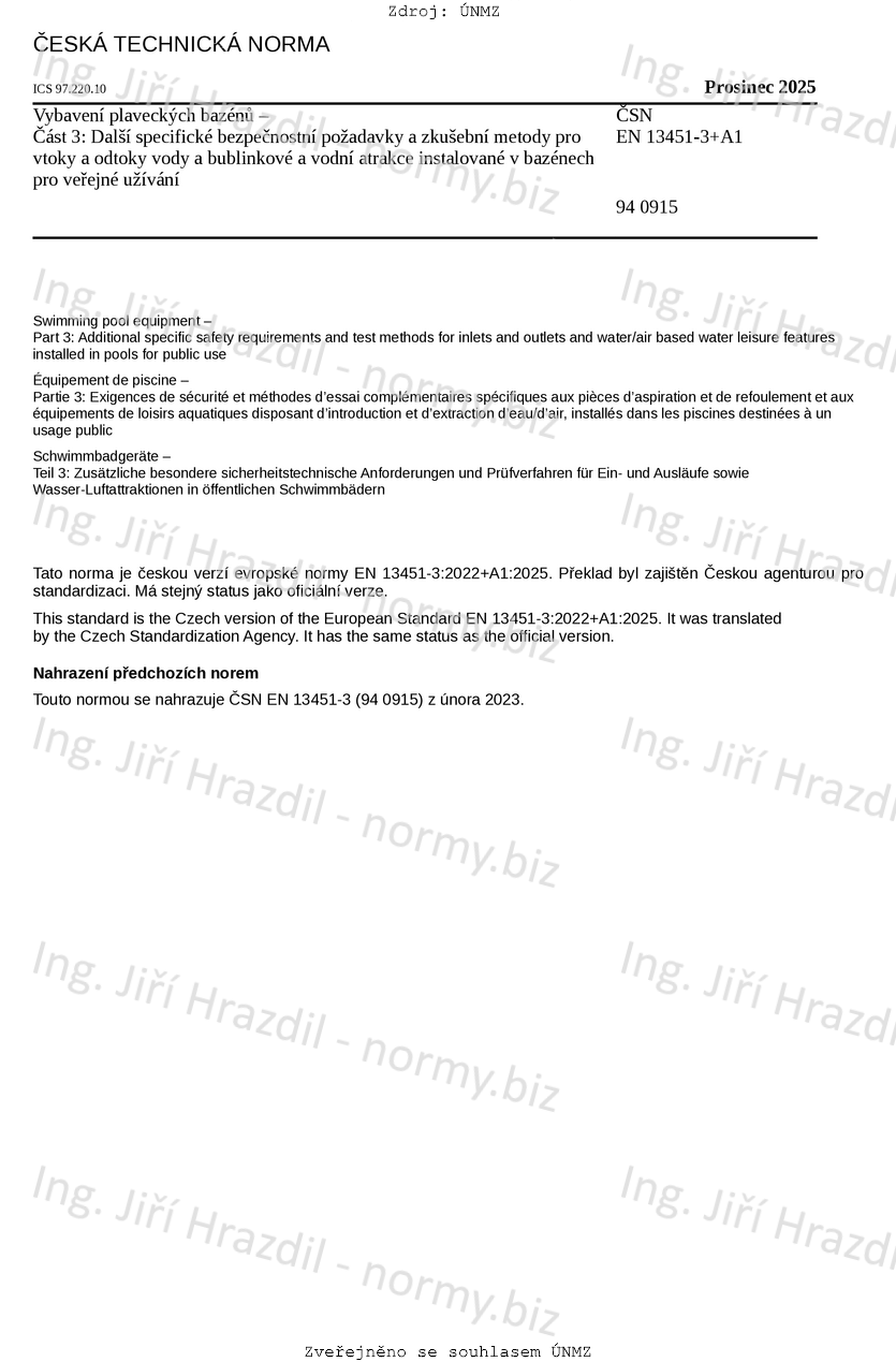 Vybavení plaveckých bazénů - Část 1: Obecné bezpečnostní požadavky a zkušební metody pro vybavení instalovaná v bazénech pro veřejné užívání