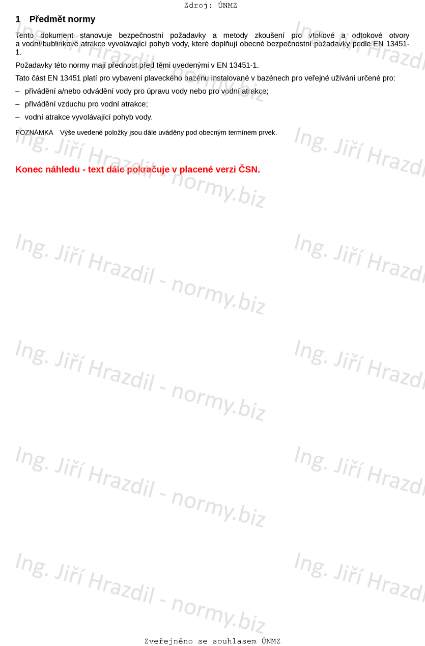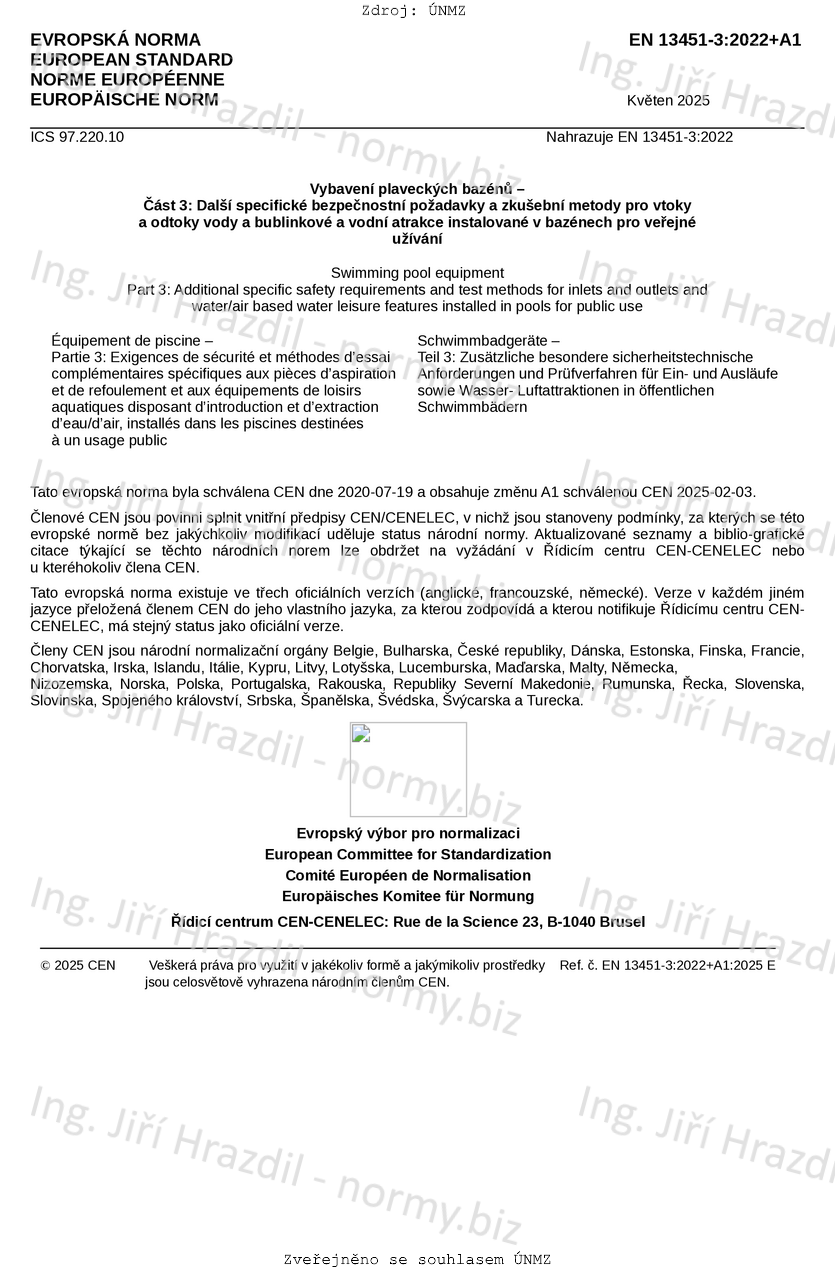 Tento dokument stanovuje bezpečnostní požadavky a metody zkoušení pro vtokové a odtokové otvory a vodní/bublinkové atrakce vyvolávající pohyb vody, které doplňují obecné bezpečnostní požadavky podle EN 13451-1.