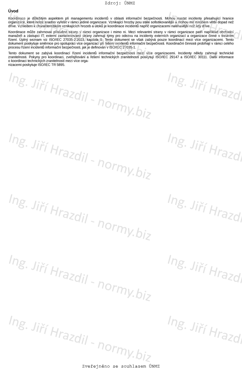 Tento dokument poskytuje pokyny pro více organizací, které koordinovaně řeší incidenty informační bezpeč-nosti. Zabývá se také dopady externí spolupráce na interní řízení incidentů v jednotlivých organizacích a poskytuje směrnice pro jednotlivé organizace, jak se přizpůsobit koordinačnímu procesu. Dále poskytuje směrnice pro koordinační tým, pokud existuje, k provádění koordinačních činností podporujících odezvu na incidenty napříč organizacemi.
