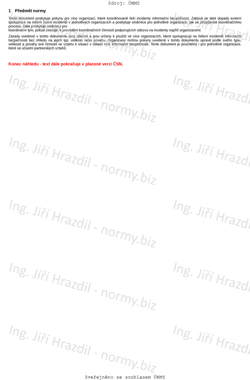 Zásady uvedené v tomto dokumentu jsou obecné a jsou určeny k použití ve více organizacích, které spolu-pracují na řešení incidentů informační bezpečnosti bez ohledu na jejich typ, velikost nebo povahu. Organiza-ce mohou pokyny uvedené v tomto dokumentu upravit podle svého typu, velikosti a povahy své činnosti ve vztahu k situaci v oblasti rizik informační bezpečnosti. Tento dokument je použitelný i pro jednotlivé organi-zace, které se účastní partnerských vztahů.