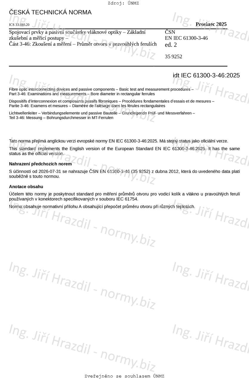 ČSN EN IEC 61300-3-46 ed. 2 Spojovací prvky a pasivní součástky vláknové optiky - Základní zkušební a měřicí postupy - Část 3-46: Zkoušení a měření - Průměr otvoru v pravoúhlých ferulích