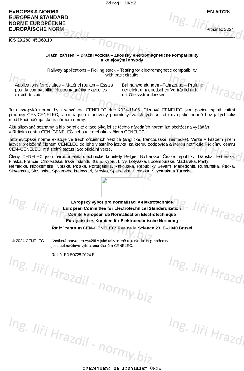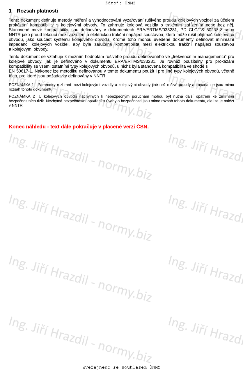 Tento dokument definuje metody zkoušení, měření a vyhodnocování vyzařování rušivého proudu kolejových vozidel za účelem prokázání kompatibility s kolejovými obvody. Hodnocení se provádí na rozhraní mezi kolejovými vozidly a infrastrukturou (celkový rušivý proud IU), nikoli na přijímači kolejového obvodu.
