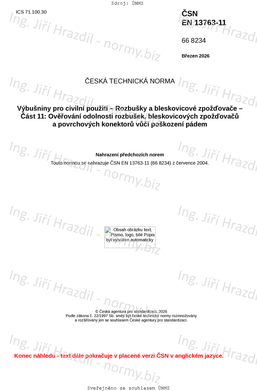 ČSN EN 13763-11 Výbušniny pro civilní použití - Rozbušky a bleskovicové zpožďovače - Část 11: Ověřování odolnosti rozbušek, bleskovicových zpožďovačů a povrchových konektorů vůči poškození pádem