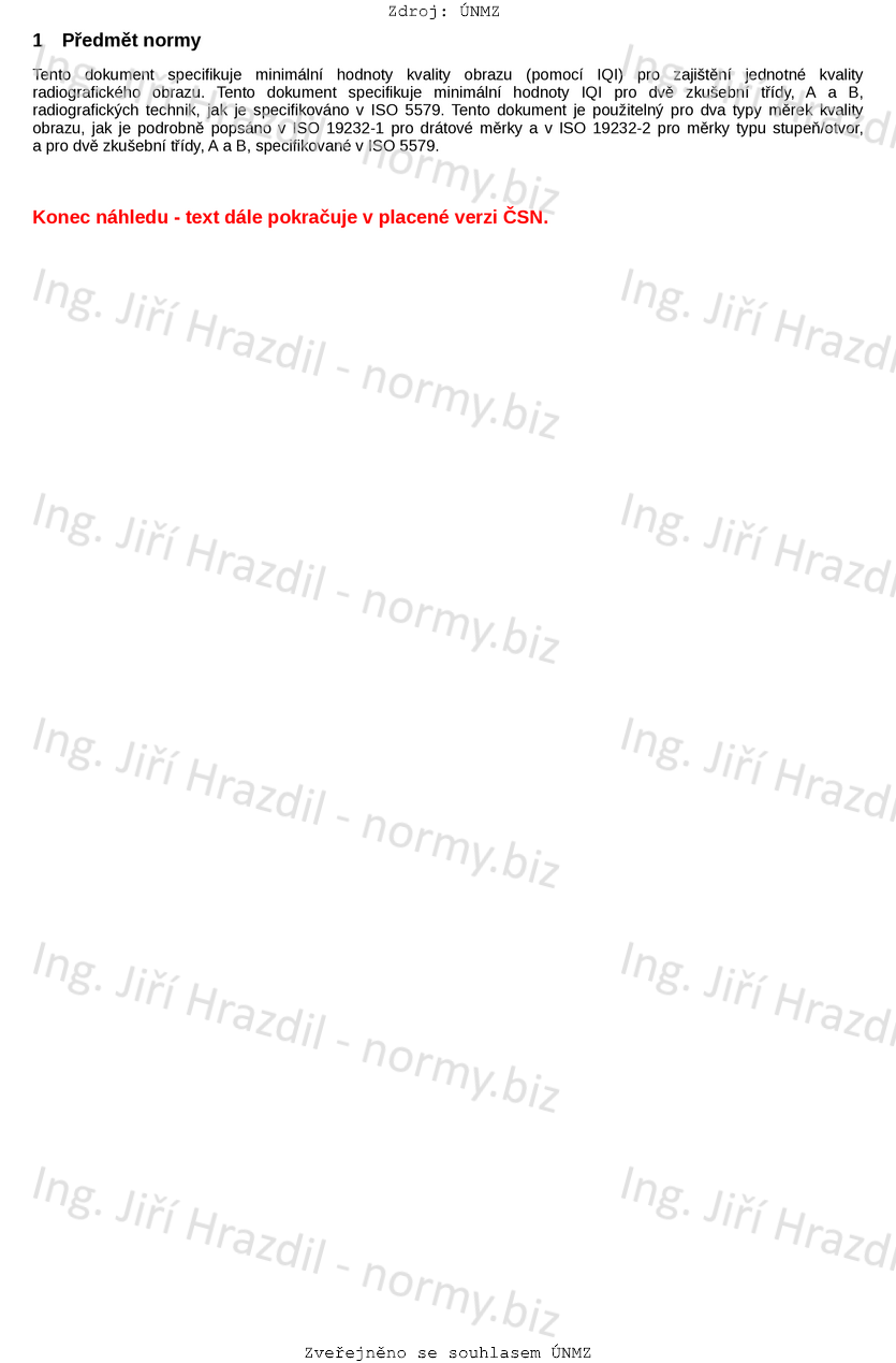Tento dokument specifikuje minimální hodnoty kvality obrazu (pomocí IQI) pro zajištění jednotné kvality radiografického obrazu. Tento dokument specifikuje minimální hodnoty IQI pro dvě zkušební třídy, A a B, radiografických technik, jak je specifikováno v ISO 5579. Tento dokument je použitelný pro dva typy měrek kvality obrazu, jak je podrobně popsáno v ISO 19232-1 pro drátové měrky a v ISO 19232-2 pro měrky typu stupeň/otvor, a pro dvě zkušební třídy, A a B, specifikované v ISO 5579.