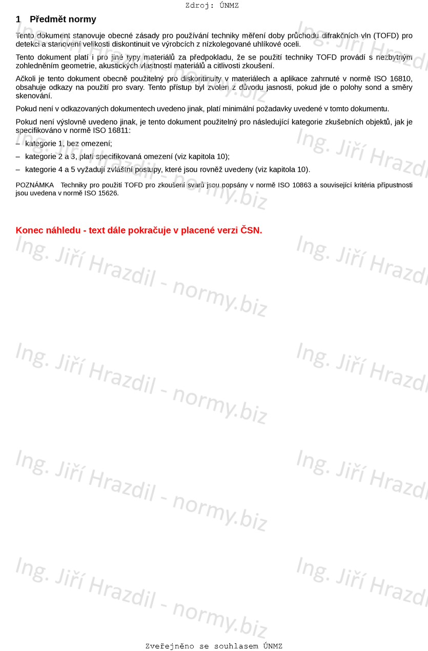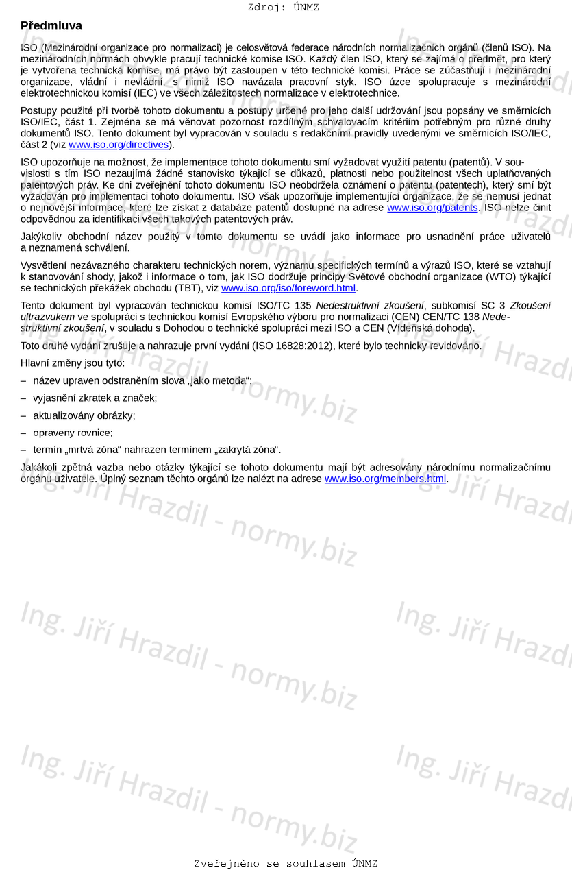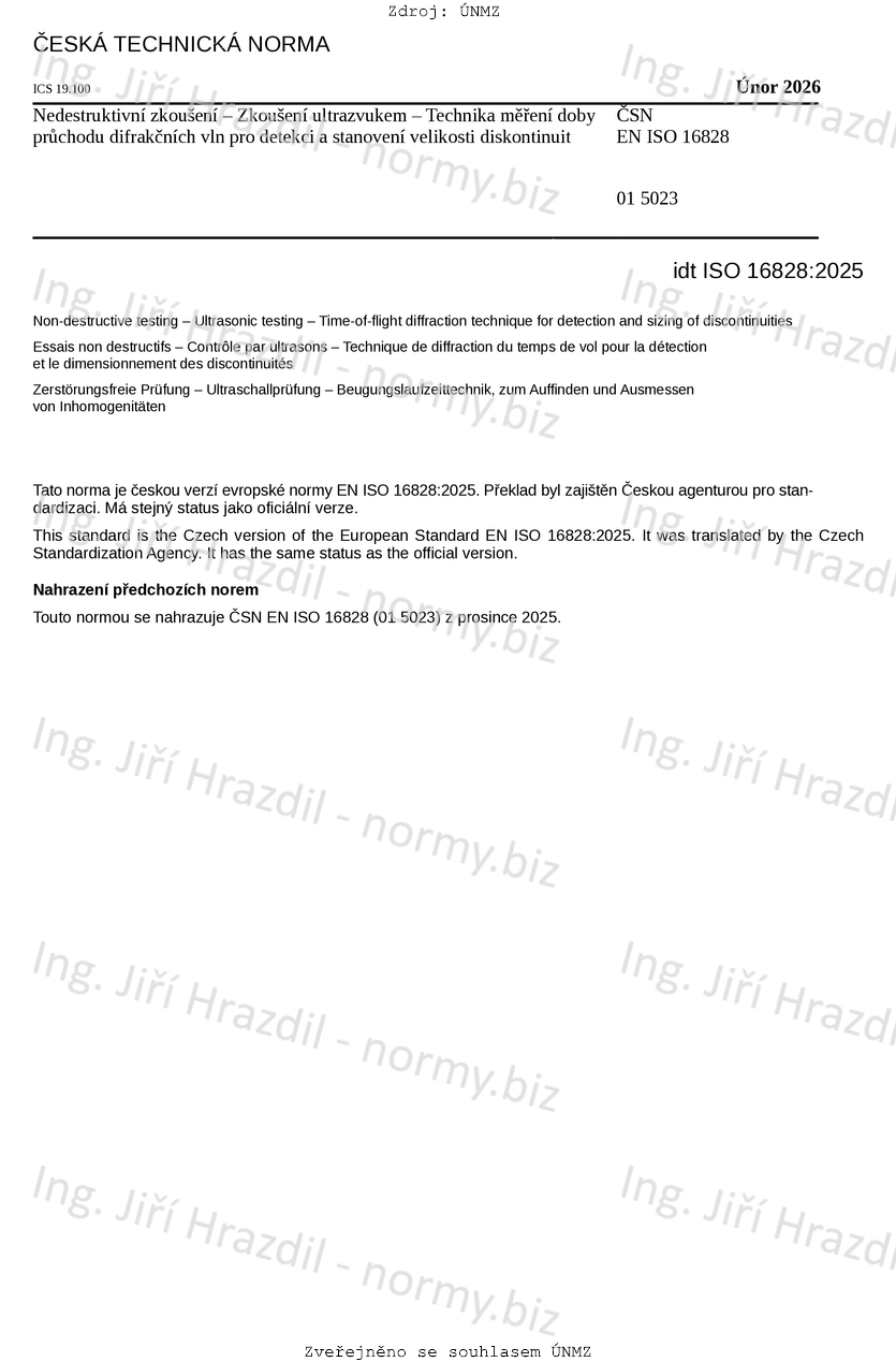 ČSN EN ISO 16828 Nedestruktivní zkoušení - Zkoušení ultrazvukem - Technika měření doby průchodu difrakčních vln pro detekci a stanovení velikosti diskontinuit