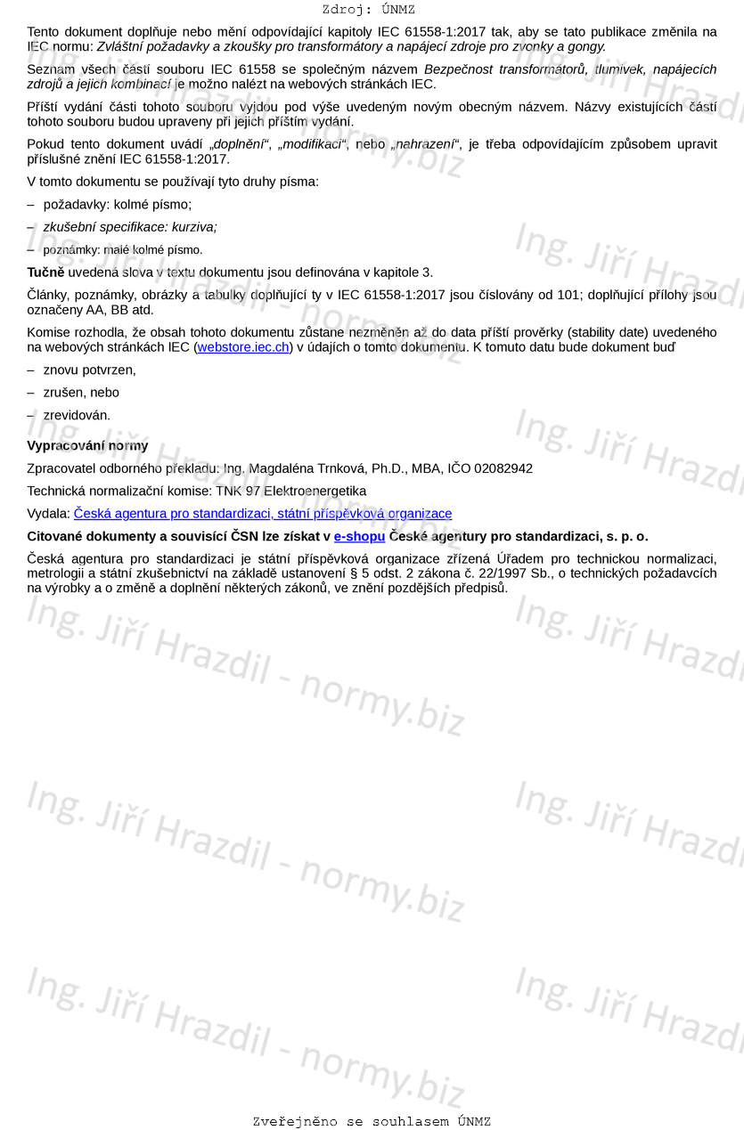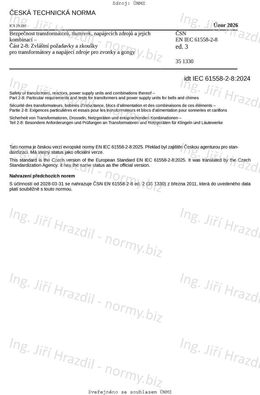 ČSN EN IEC 61558-2-8 ed. 3 Bezpečnost transformátorů, tlumivek, napájecích zdrojů a jejich kombinací - Část 2-8: Zvláštní požadavky a zkoušky pro transformátory a napájecí zdroje pro zvonky a gongy