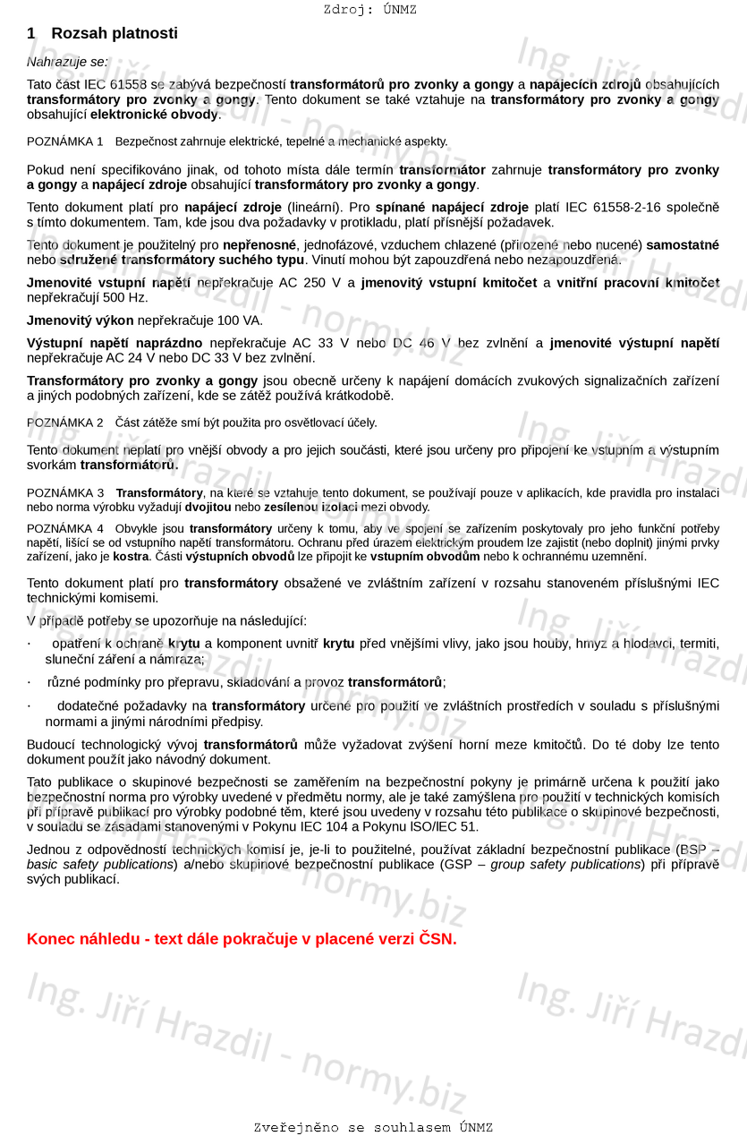 Tento dokument se zabývá obecnými požadavky na bezpečnost transformátorů pro zvonky a gongy a napájecích zdrojů obsahujících transformátory pro zvonky a gongy. Požadavky, zde uvedené, se rovněž vztahují na transformátory pro zvonky a gongy, obsahující elektronické obvody.