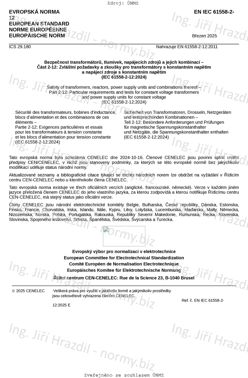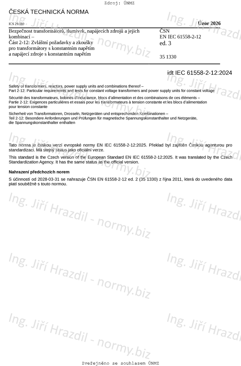 ČSN EN IEC 61558-2-12 ed. 3 Bezpečnost transformátorů, tlumivek, napájecích zdrojů a jejich kombinací - Část 2-12: Zvláštní požadavky a zkoušky pro transformátory s konstantním napětím a napájecí zdroje s konstantním napětím