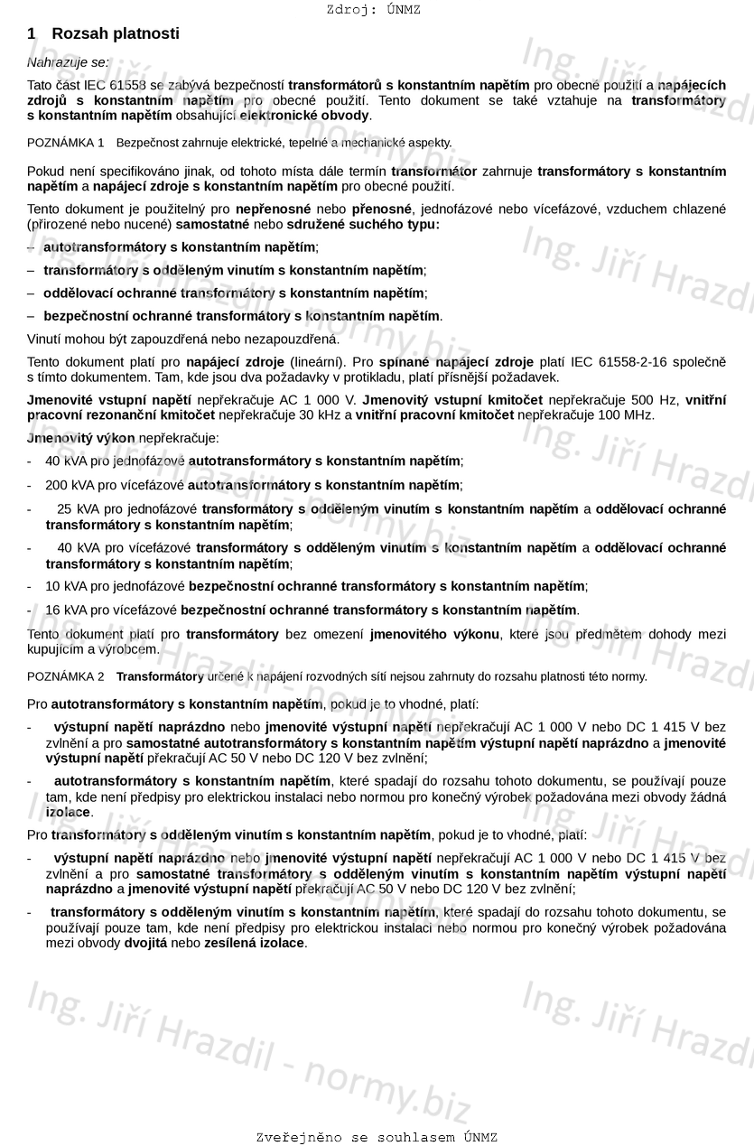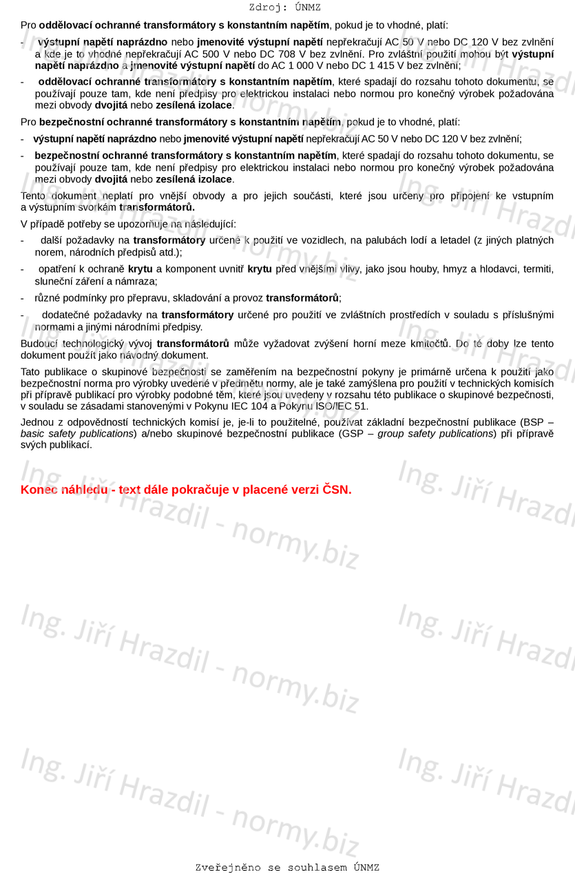 Tento dokument se zabývá obecnými požadavky na bezpečnost transformátorů s konstantním napětím pro obecné použití a napájecích zdrojů s konstantním napětím pro obecné použití. Požadavky, zde uvedené, se rovněž vztahují na transformátory s konstantním napětím obsahující elektronické obvody.