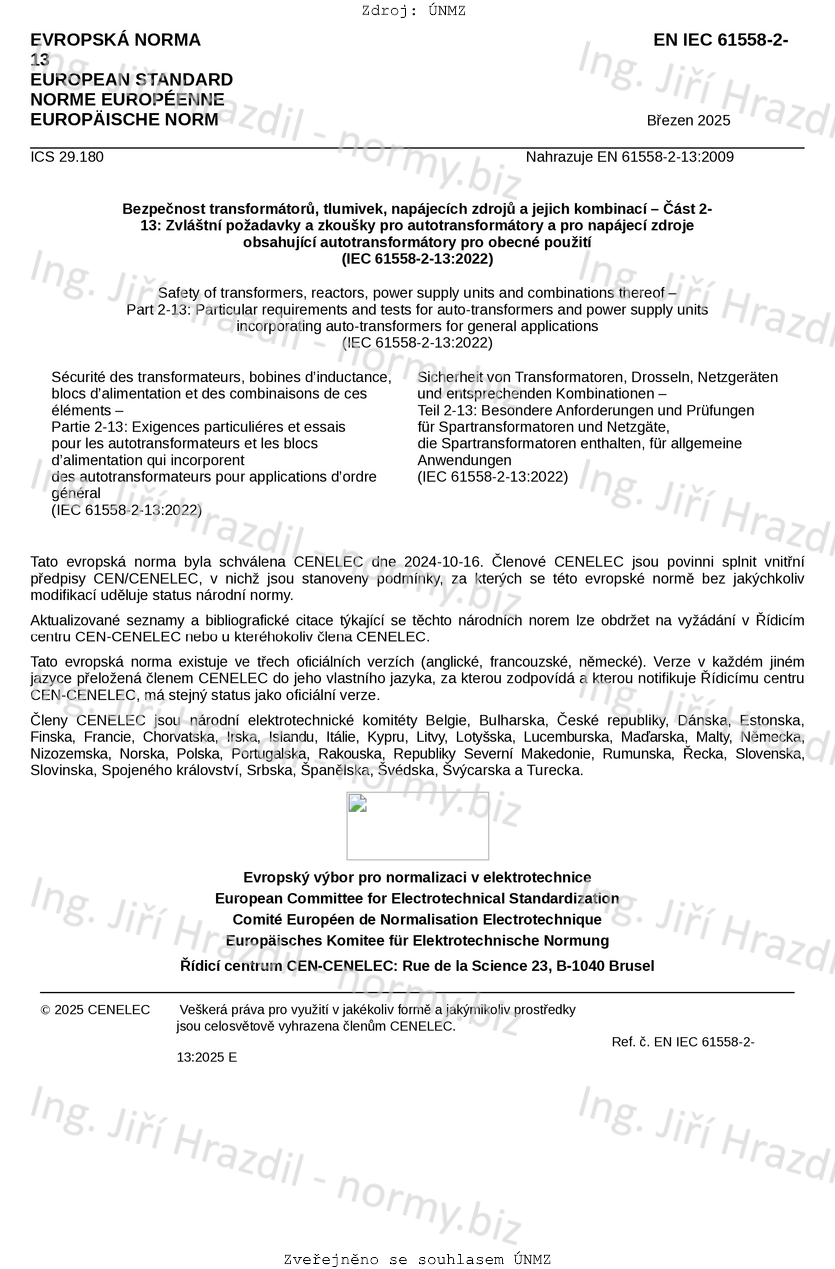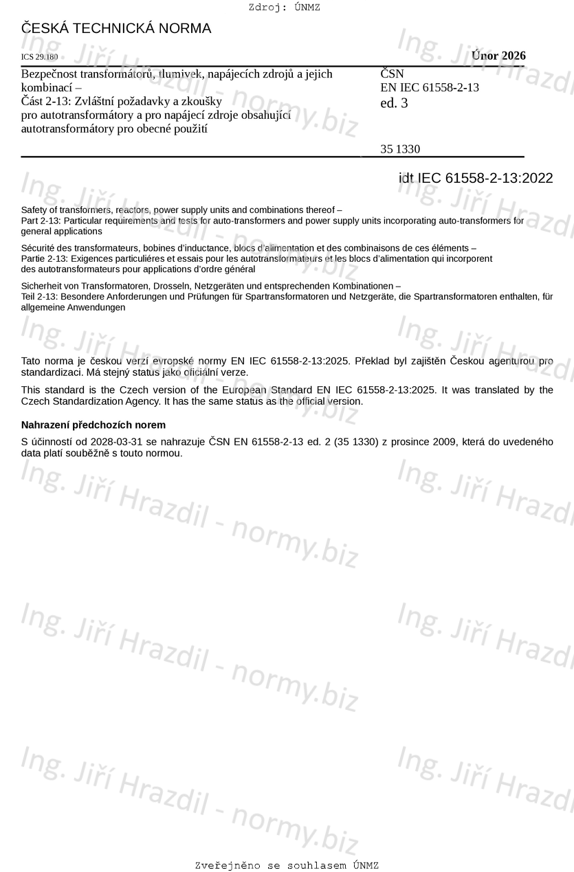 Bezpečnost transformátorů, tlumivek, napájecích zdrojů a podobných výrobků pro napájecí napětí do 1 100 V - Část 2-13: Zvláštní požadavky a zkoušky pro autotransformátory a pro napájecí zdroje obsahující autotransformátory