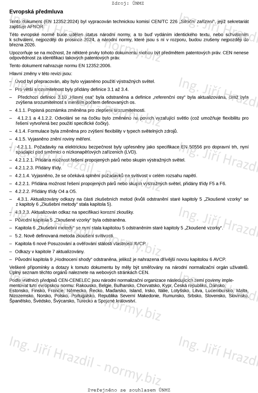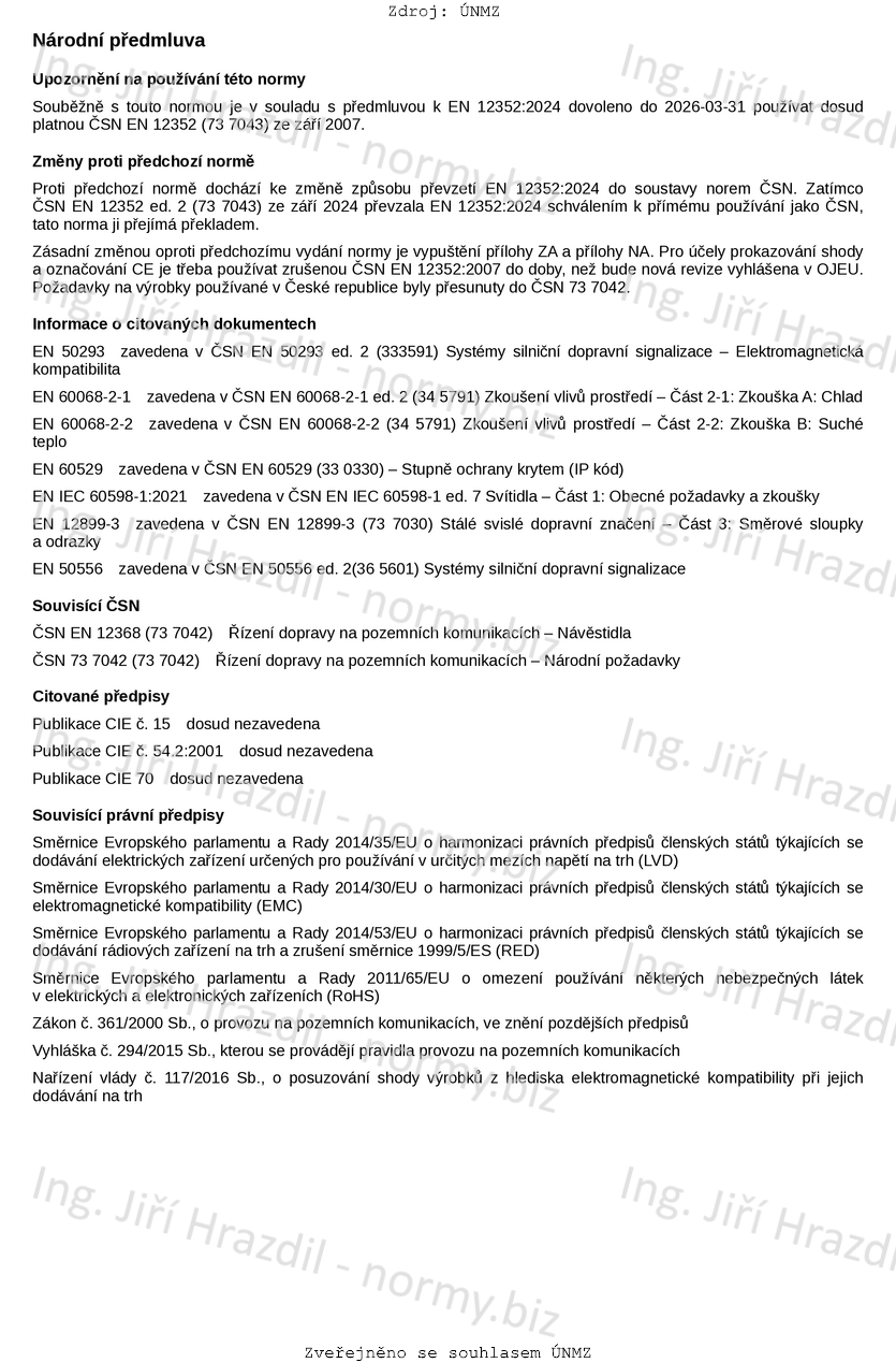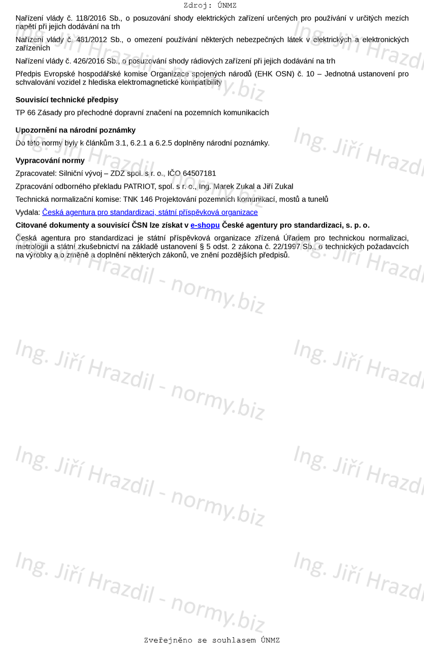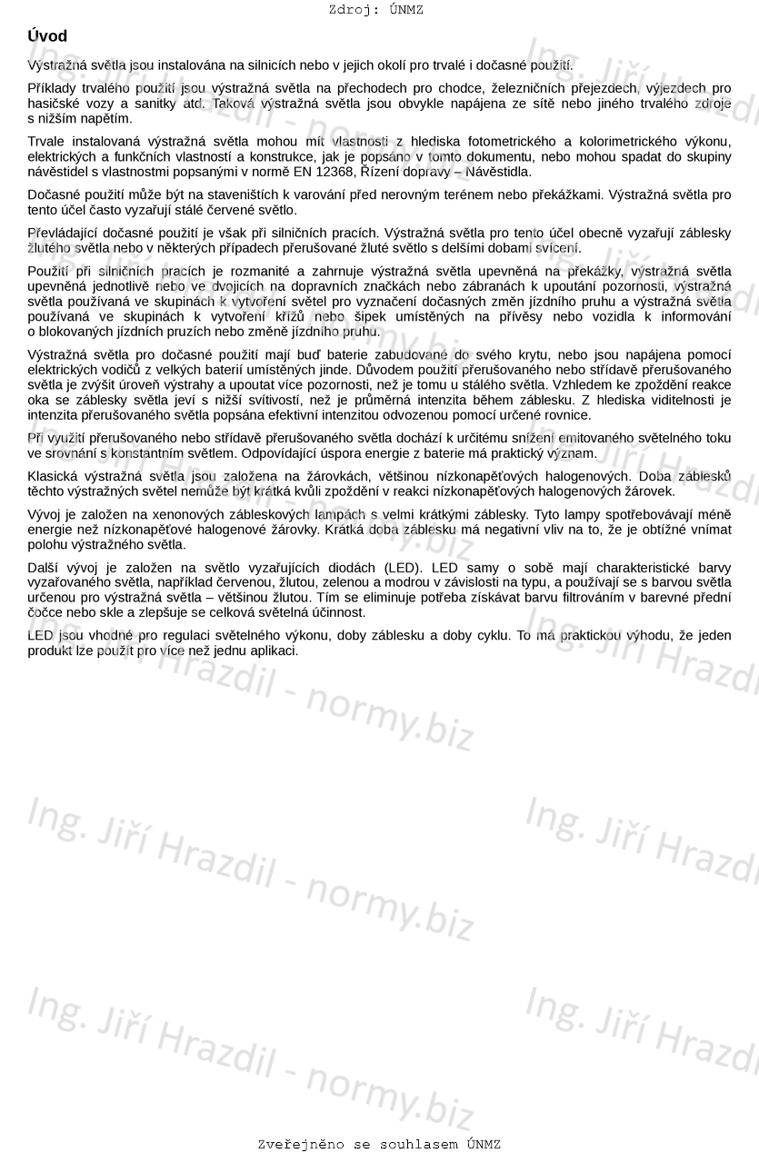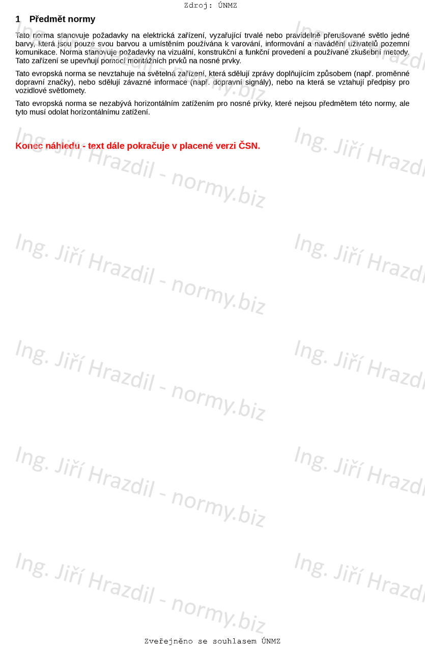 Tato norma stanovuje požadavky na elektrická zařízení, vyzařující trvalé nebo pravidelně přerušované světlo jedné barvy, která jsou pouze svou barvou a umístěním používána k varování, informování a navádění uživatelů pozemní komunikace. Norma stanovuje požadavky na vizuální, konstrukční a funkční provedení a používané zkušební metody. Tato zařízení se upevňují pomocí montážních prvků na nosné prvky.