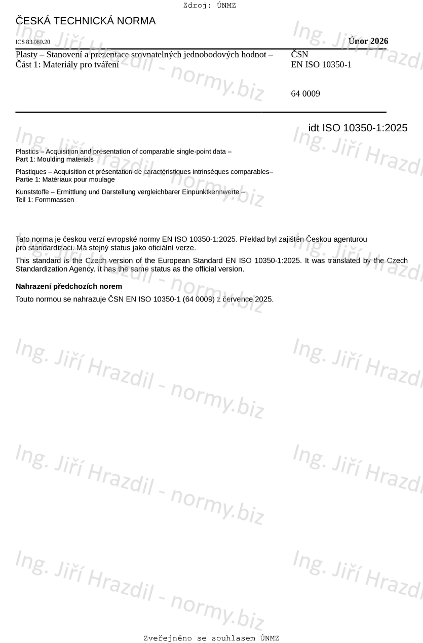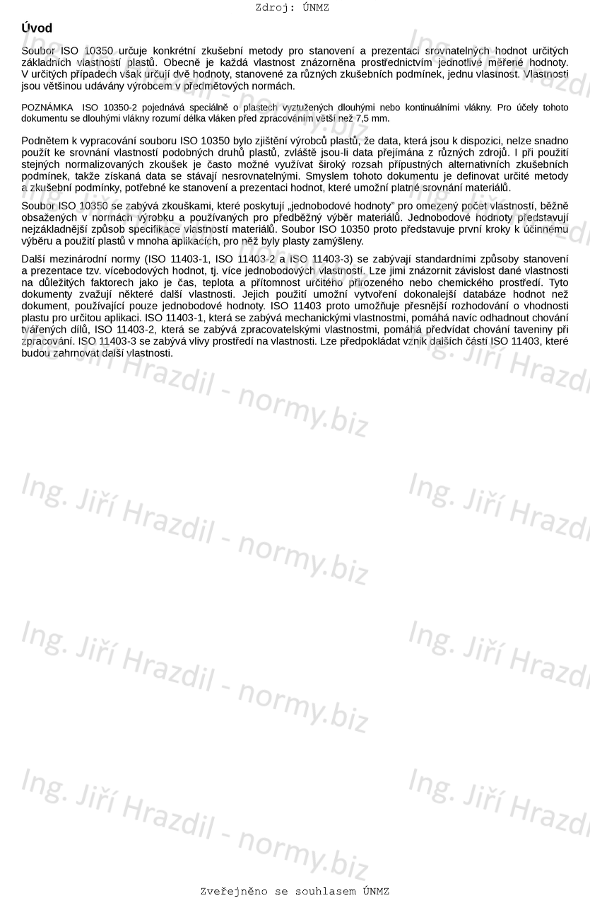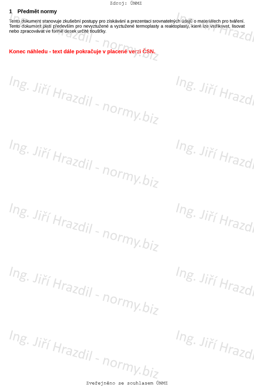 Tento dokument stanovuje zkušební postupy pro získávání a prezentaci srovnatelných údajů o materiálech pro tváření. Tento dokument platí především pro nevyztužené a vyztužené termoplasty a reaktoplasty, které lze vstřikovat, lisovat nebo zpracovávat ve formě desek určité tloušťky.