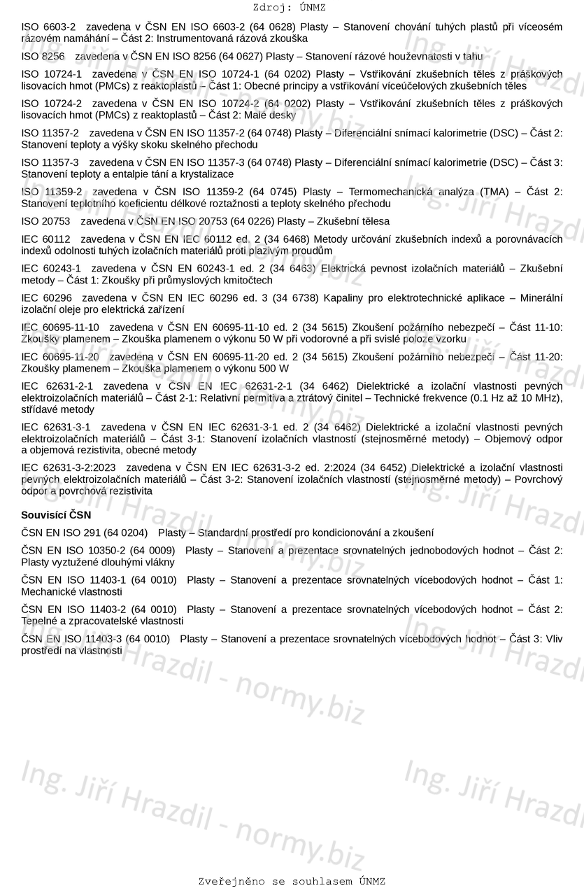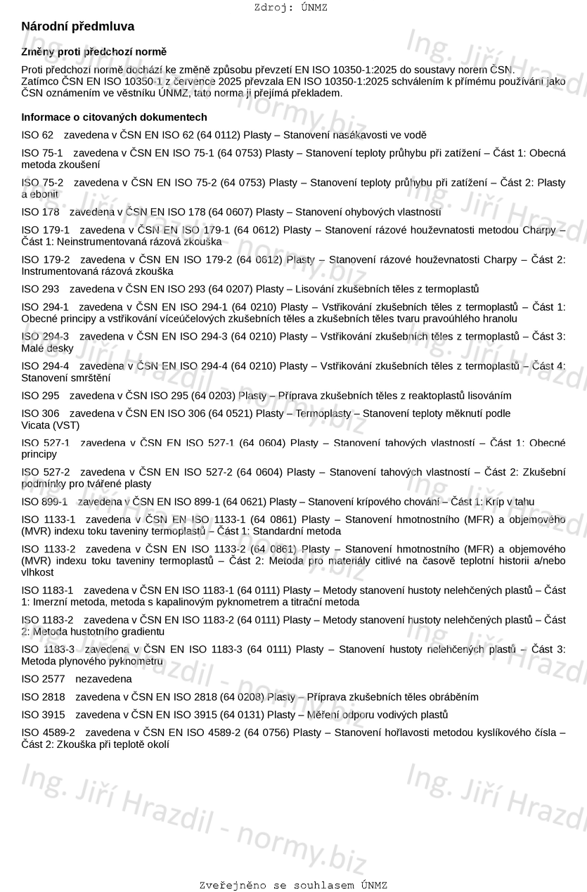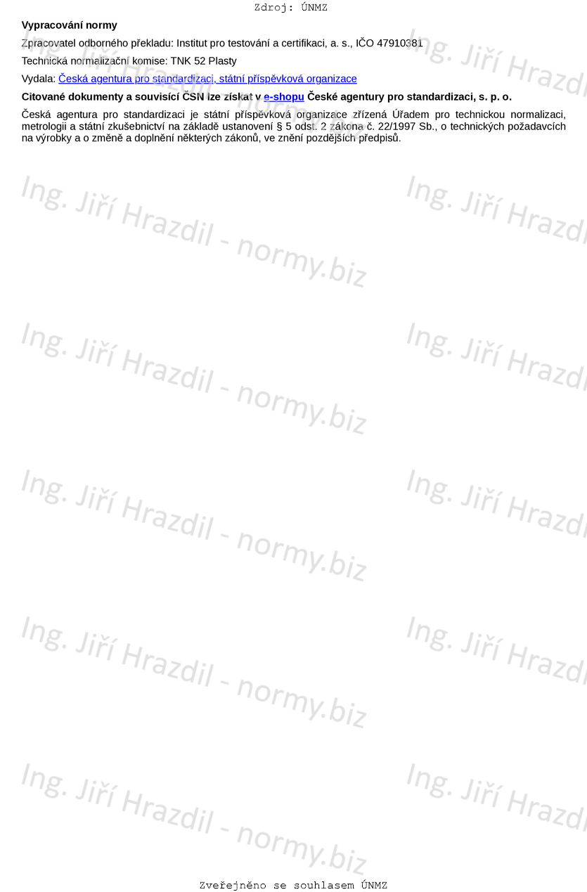 Tento dokument stanovuje zkušební postupy pro získávání a prezentaci srovnatelných údajů o materiálech pro tváření. Tento dokument platí především pro nevyztužené a vyztužené termoplasty a reaktoplasty, které lze vstřikovat, lisovat nebo zpracovávat ve formě desek určité tloušťky.