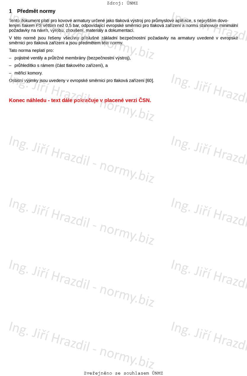 Tento dokument platí pro kovové armatury určené jako tlaková výstroj pro průmyslové aplikace, s nejvyšším dovoleným tlakem PS větším než 0,5 bar, odpovídající evropské směrnici pro tlaková zařízení a norma stanovu-je minimální požadavky na návrh, výrobu, zkoušení, materiály a dokumentaci.