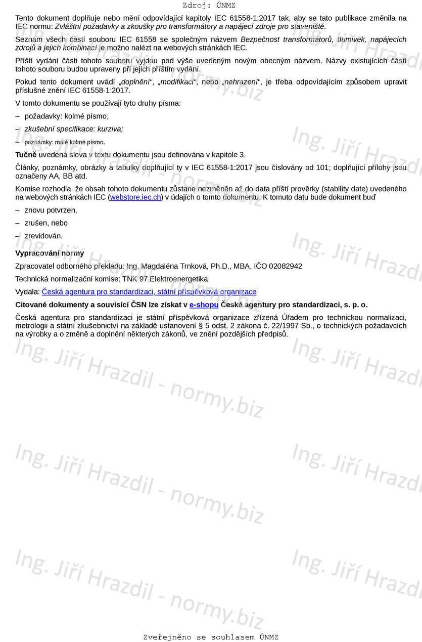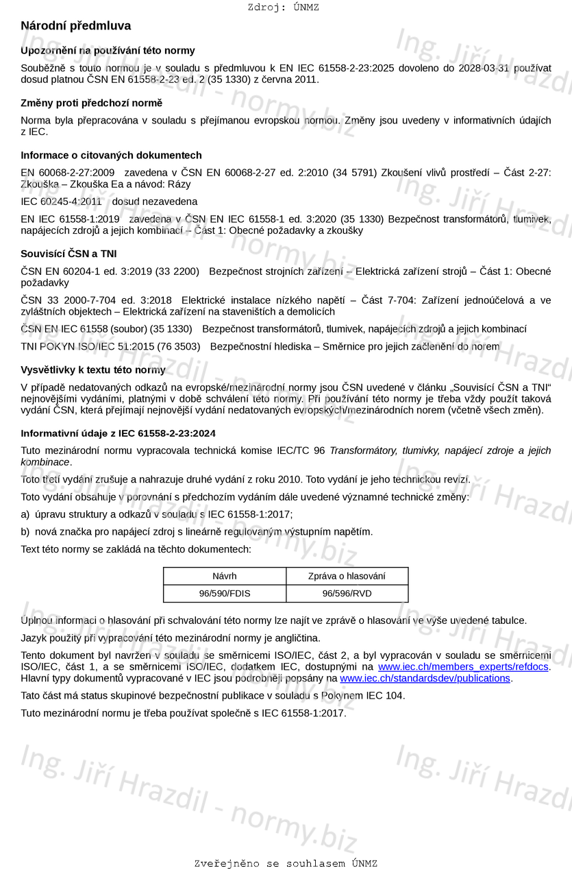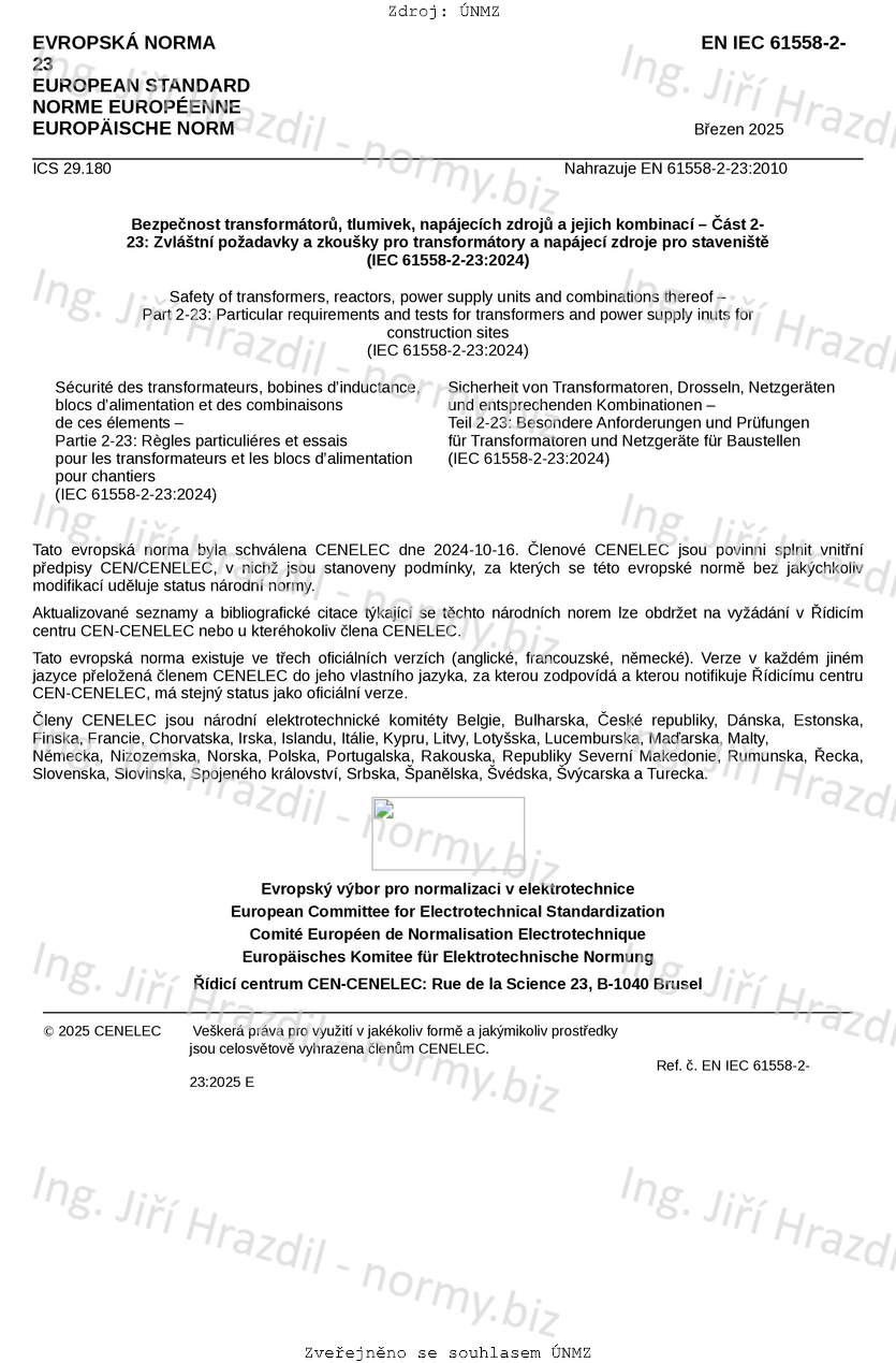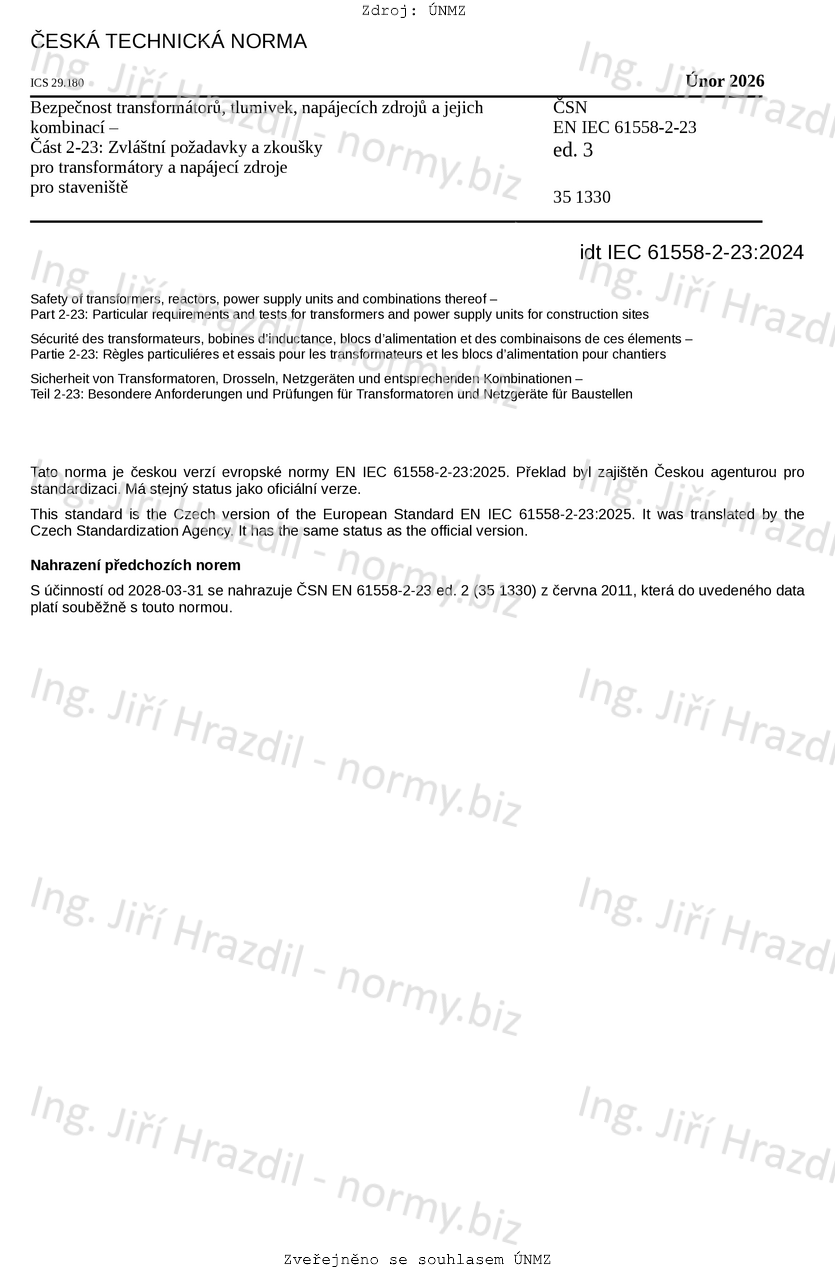 ČSN EN IEC 61558-2-23 ed. 3 Bezpečnost transformátorů, tlumivek, napájecích zdrojů a jejich kombinací - Část 2-23: Zvláštní požadavky a zkoušky pro transformátory a napájecí zdroje pro staveniště