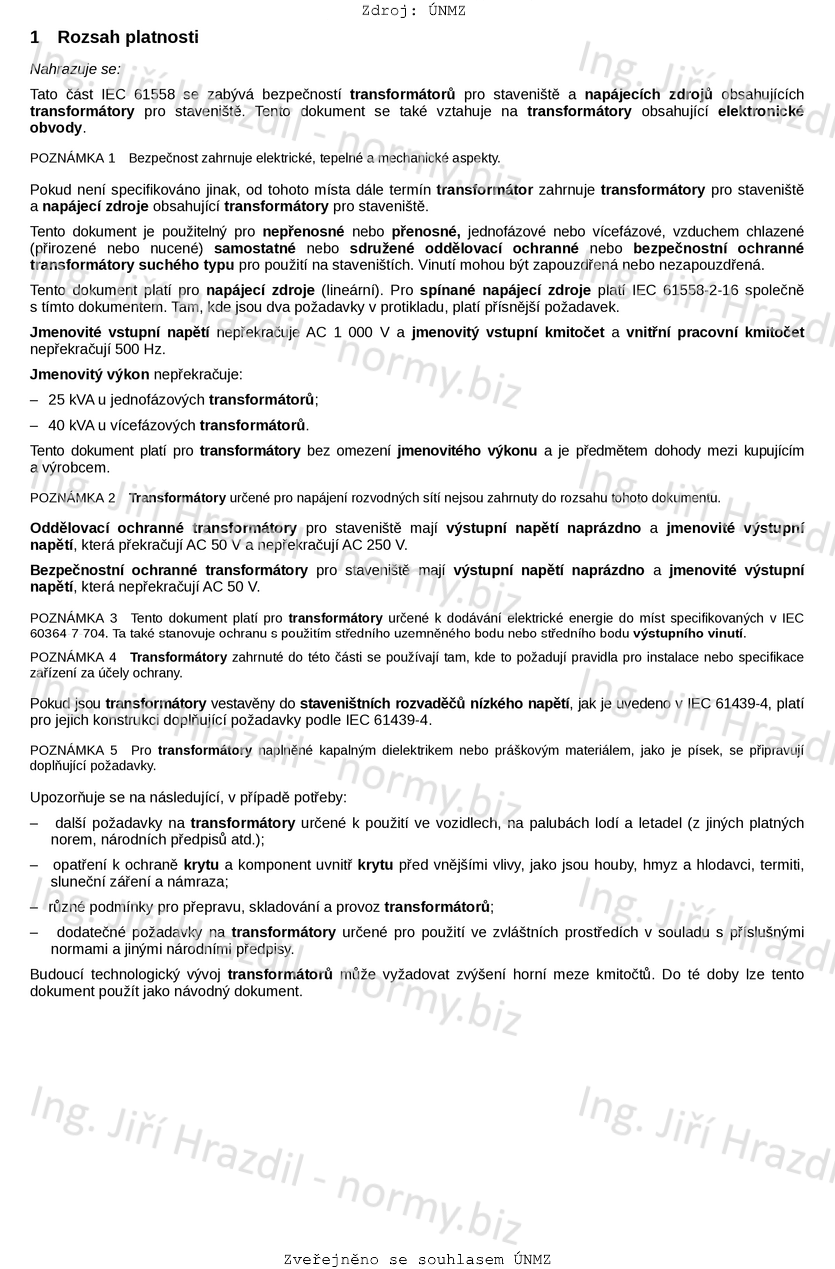Tento dokument se zabývá obecnými požadavky na bezpečnost transformátorů pro staveniště a napájecích zdrojů obsahujících transformátory pro staveniště. Tento dokument se také vztahuje na transformátory obsahující elektronické obvody. Dokument zahrnuje obecné požadavky ke zkouškám, konstrukční požadavky, včetně přehledu součástí, který s ohledem na různé specifické požadavky není zcela vyčerpávající, zároveň se však odkazuje na příslušné normy souboru IEC 61558.