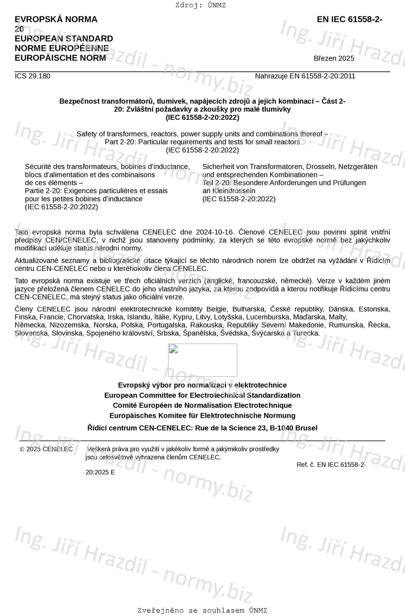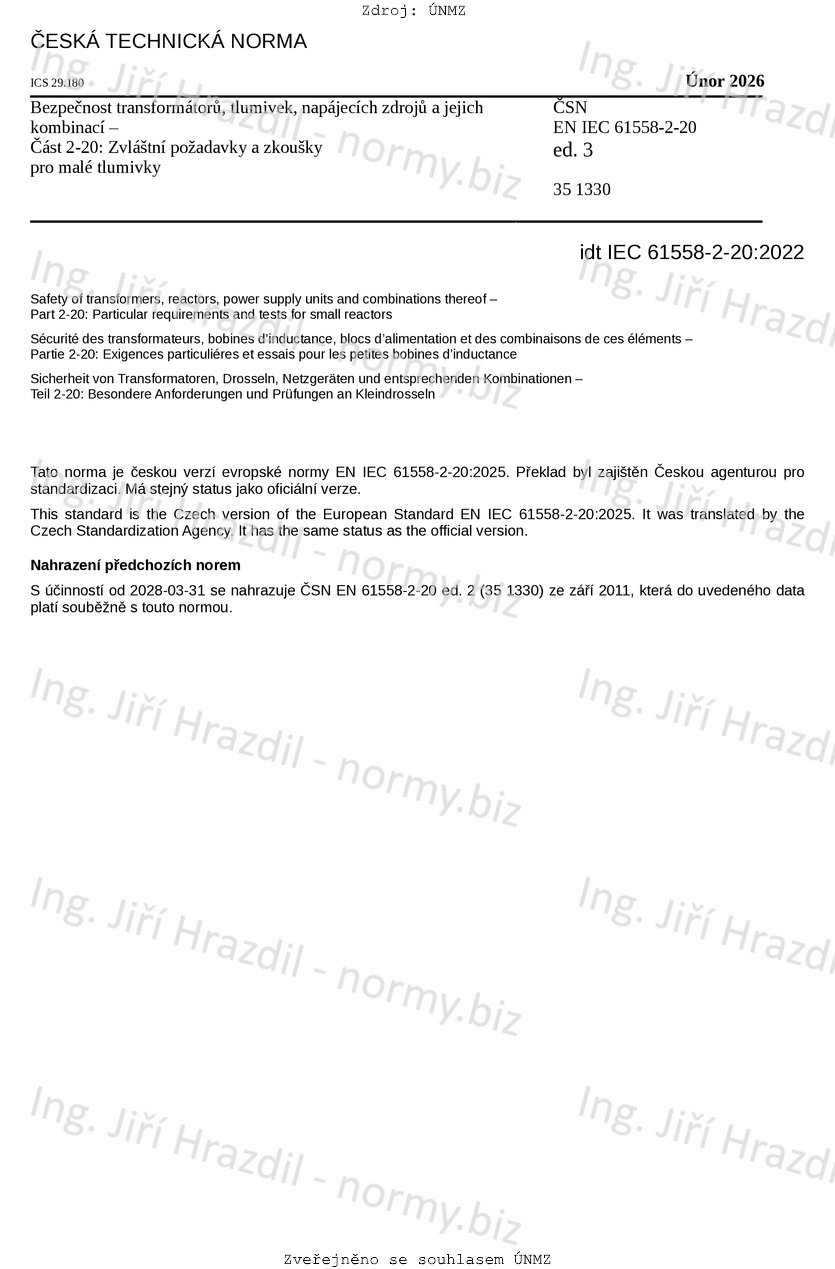 ČSN EN IEC 61558-2-20 ed. 3 Bezpečnost transformátorů, tlumivek, napájecích zdrojů a jejich kombinací - Část 2-20: Zvláštní požadavky a zkoušky pro malé tlumivky